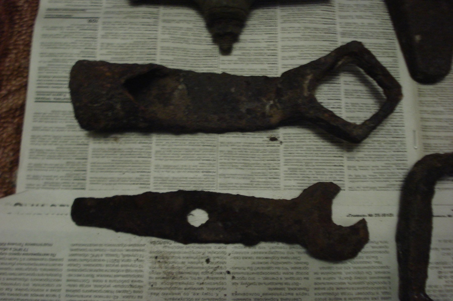 Молоток- кузнечная просечка (так вижу по таким нЭфайным фото), утюг (точнее его остатки) -конец 19-го-начало 20-го века,кран бочковой-та же датировка...Гирьку весовую поменял бы для себя на мАнеттЫ али крестики интересные (как?-спросить у Александра (Трамбиоли...)).