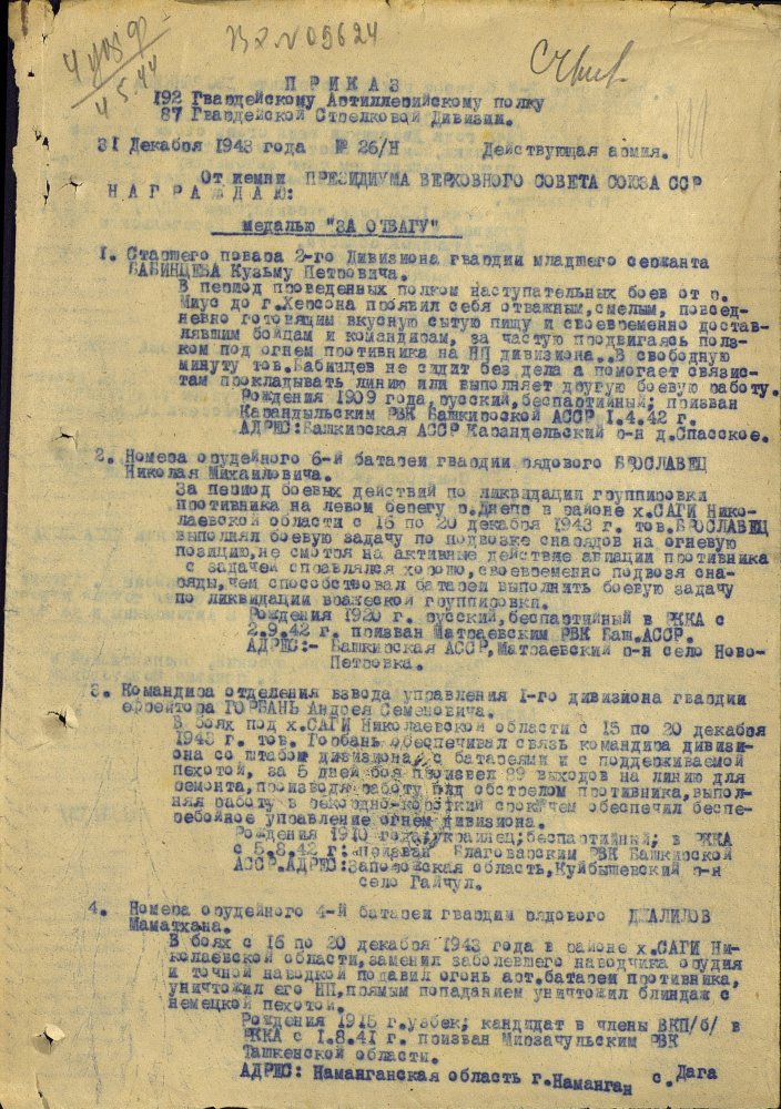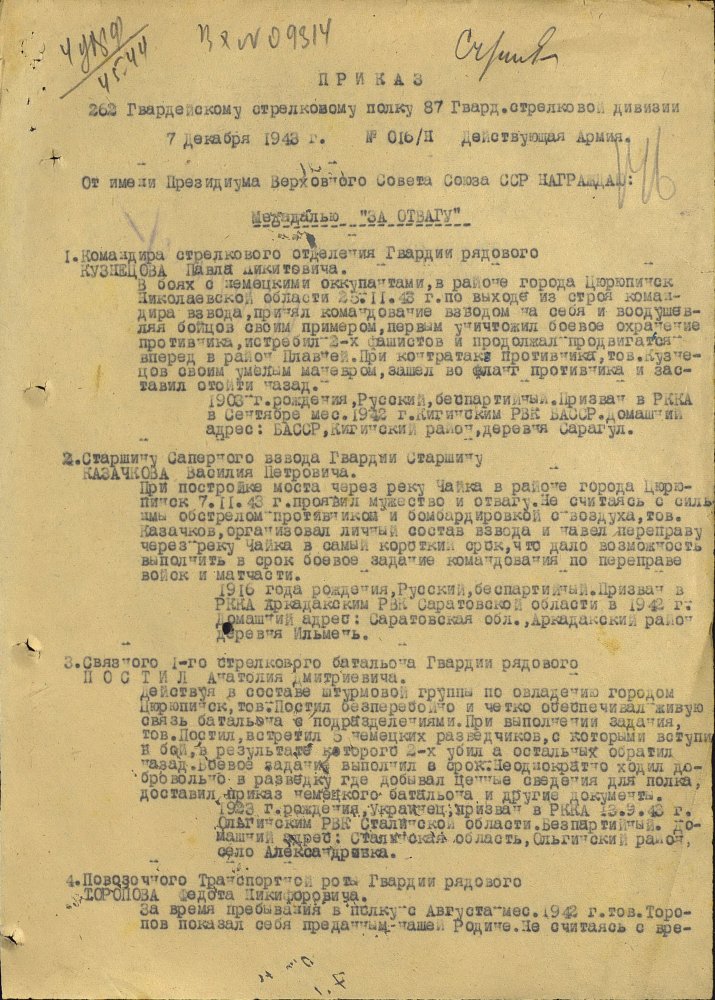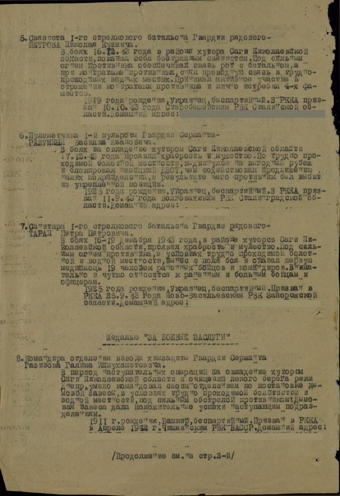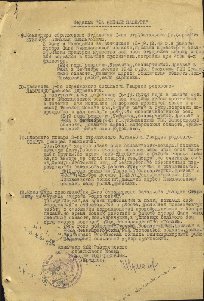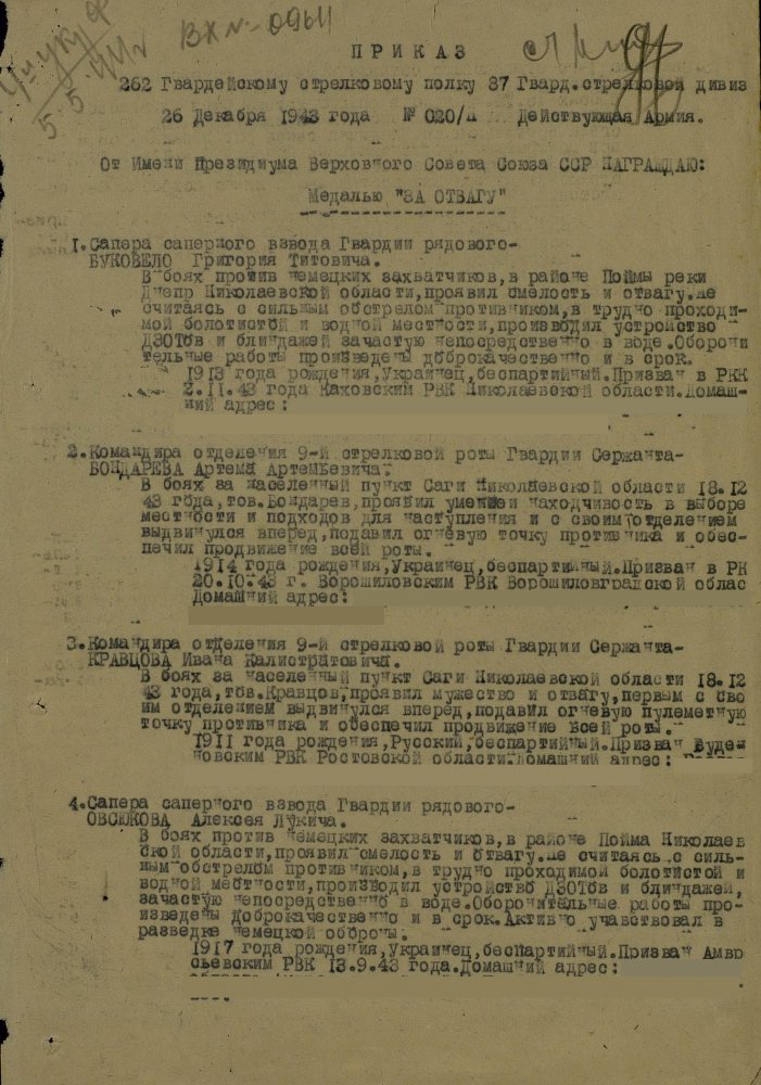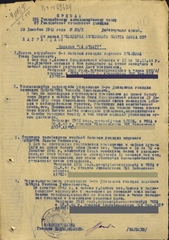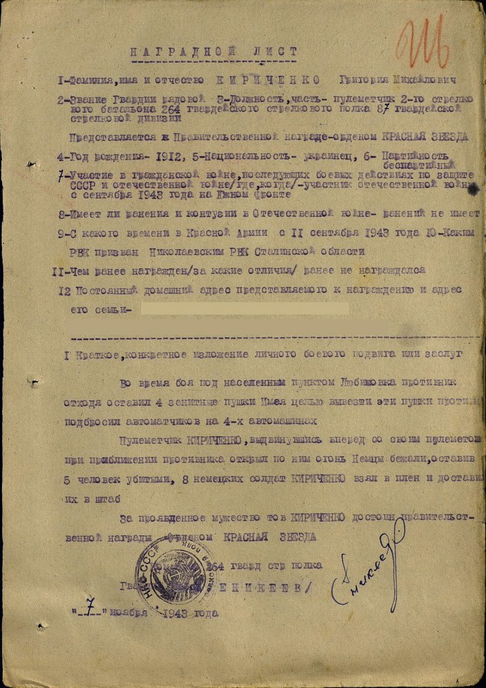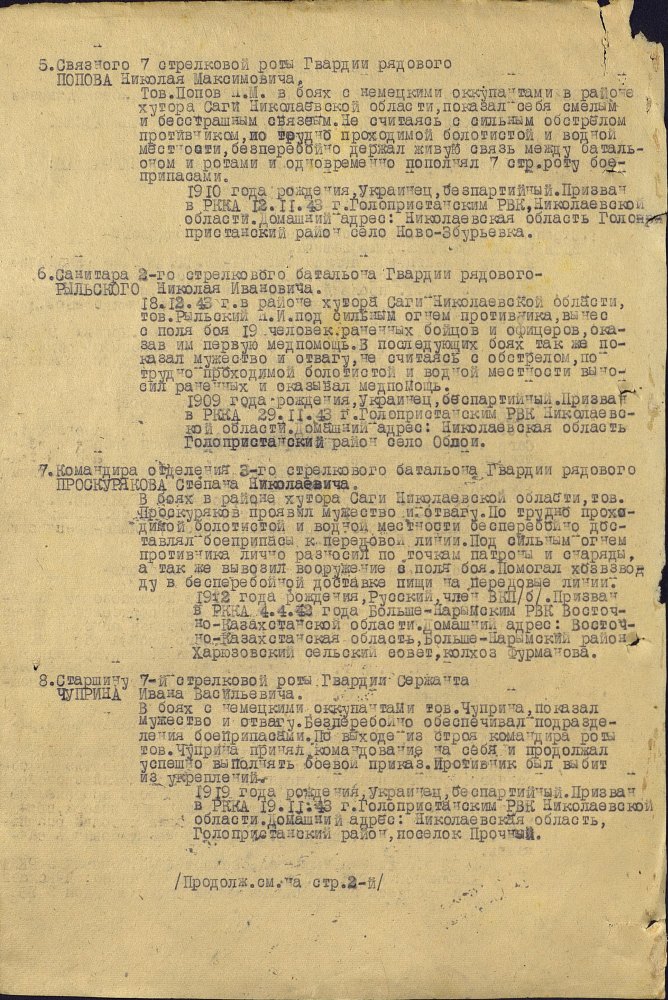 Продолжим по наградным документам за ликвидацию плацдарма. Сегодня 87 гвард. стелковая дивизия (95 листов) и 2 гвард. мехкорпус (112 листов) Опять сбитый Хейнкель, подорваннный мост через Днепр(?), потопленные катера при попытках высадки десантов... По летчикам, пересмотрел документы 8 воздушной армии за декабрь 1943 и январь 1944 - нашел по нашему плацдарму только 2 листа. Зато полно награждений за этот период по Никопольскому плацдарму.