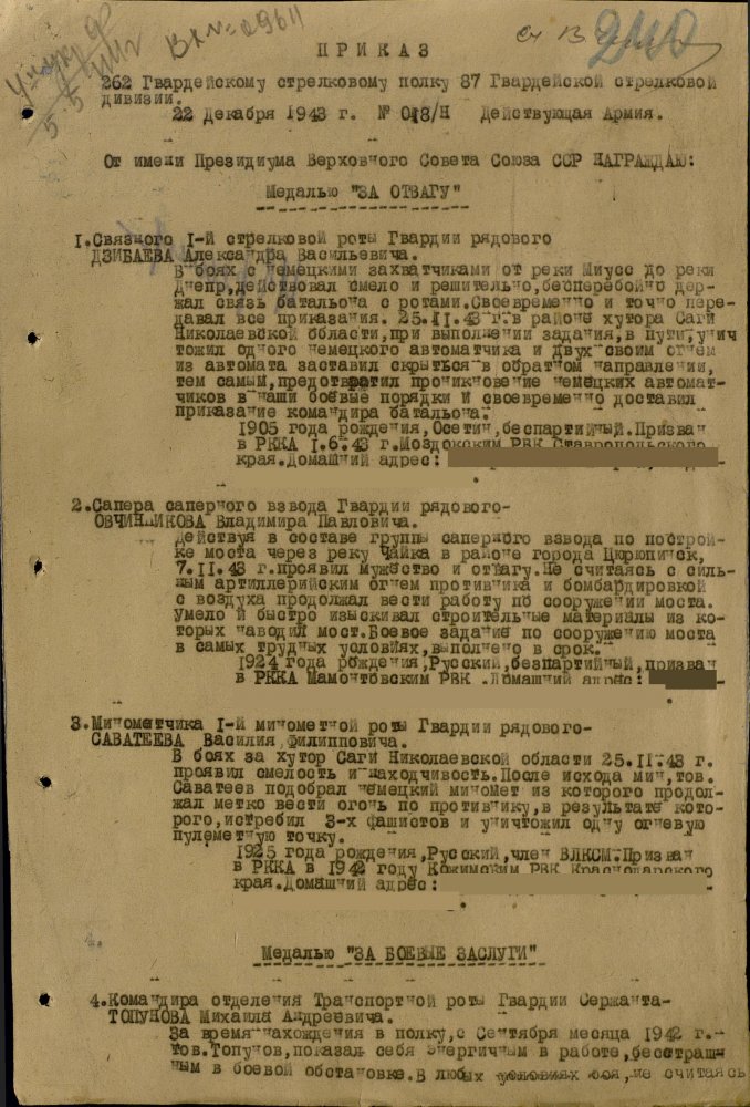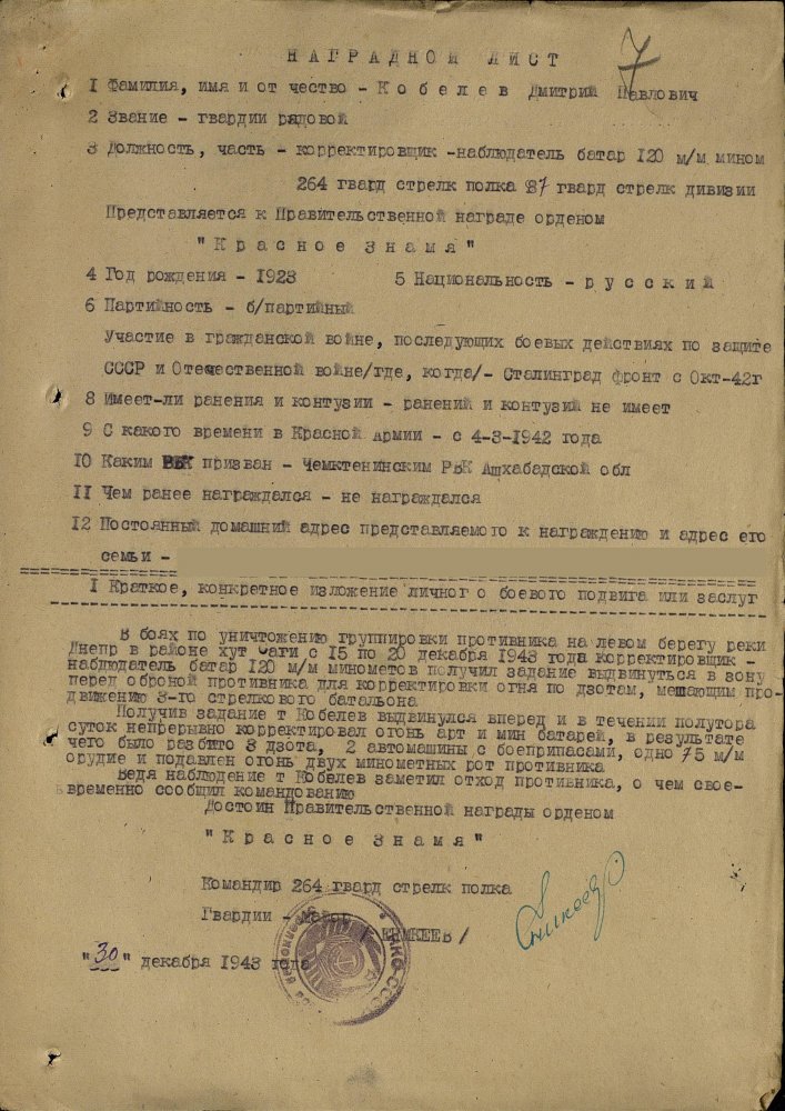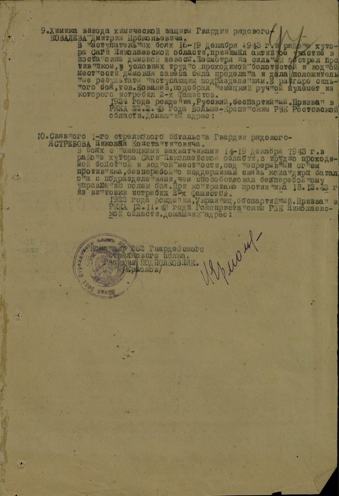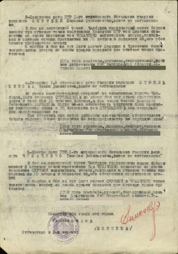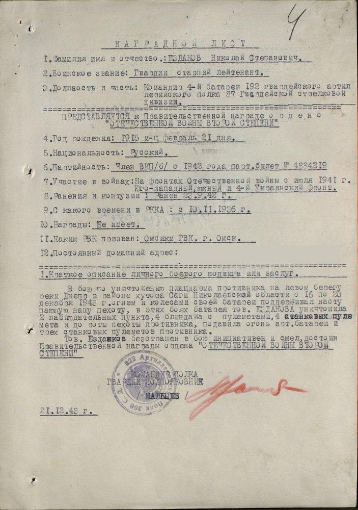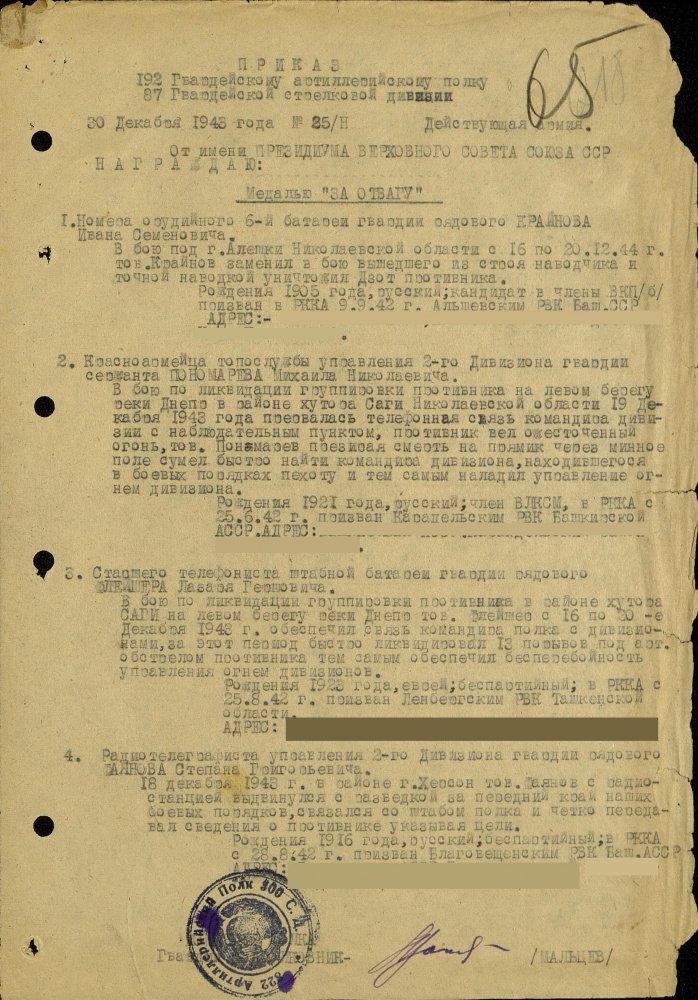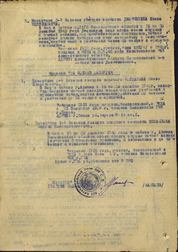 Продолжим по наградным документам за ликвидацию плацдарма. Сегодня 87 гвард. стелковая дивизия (95 листов) и 2 гвард. мехкорпус (112 листов) Опять сбитый Хейнкель, подорваннный мост через Днепр(?), потопленные катера при попытках высадки десантов... По летчикам, пересмотрел документы 8 воздушной армии за декабрь 1943 и январь 1944 - нашел по нашему плацдарму только 2 листа. Зато полно награждений за этот период по Никопольскому плацдарму.
