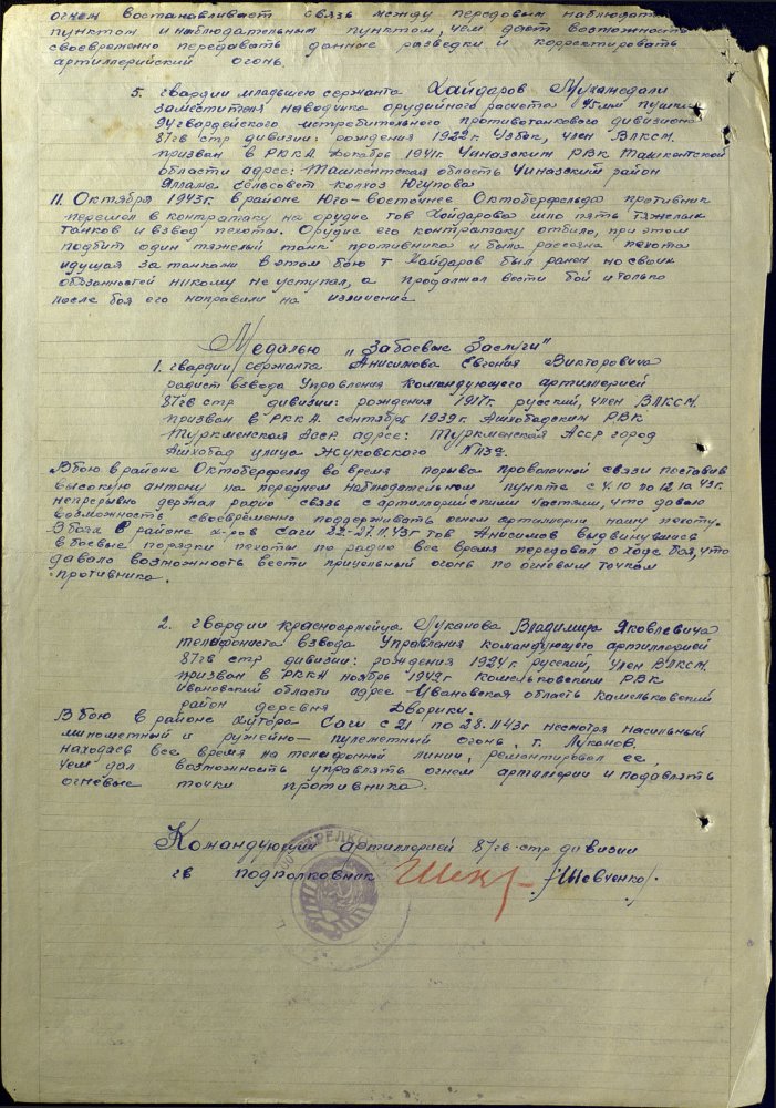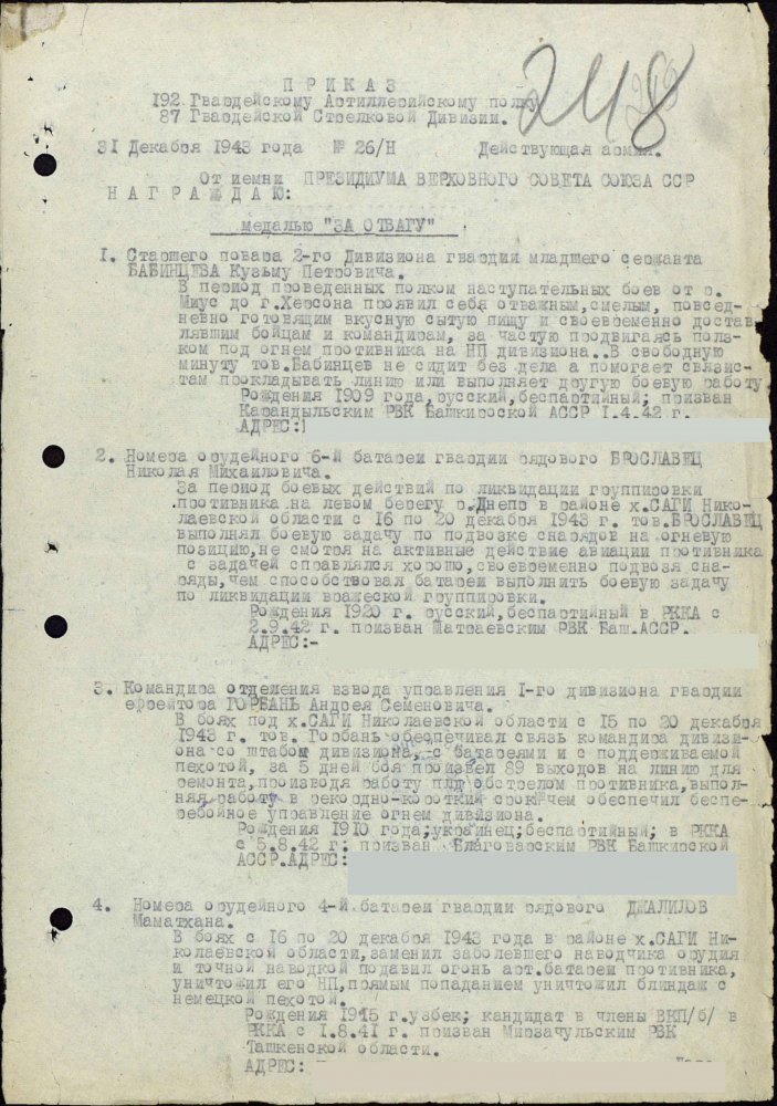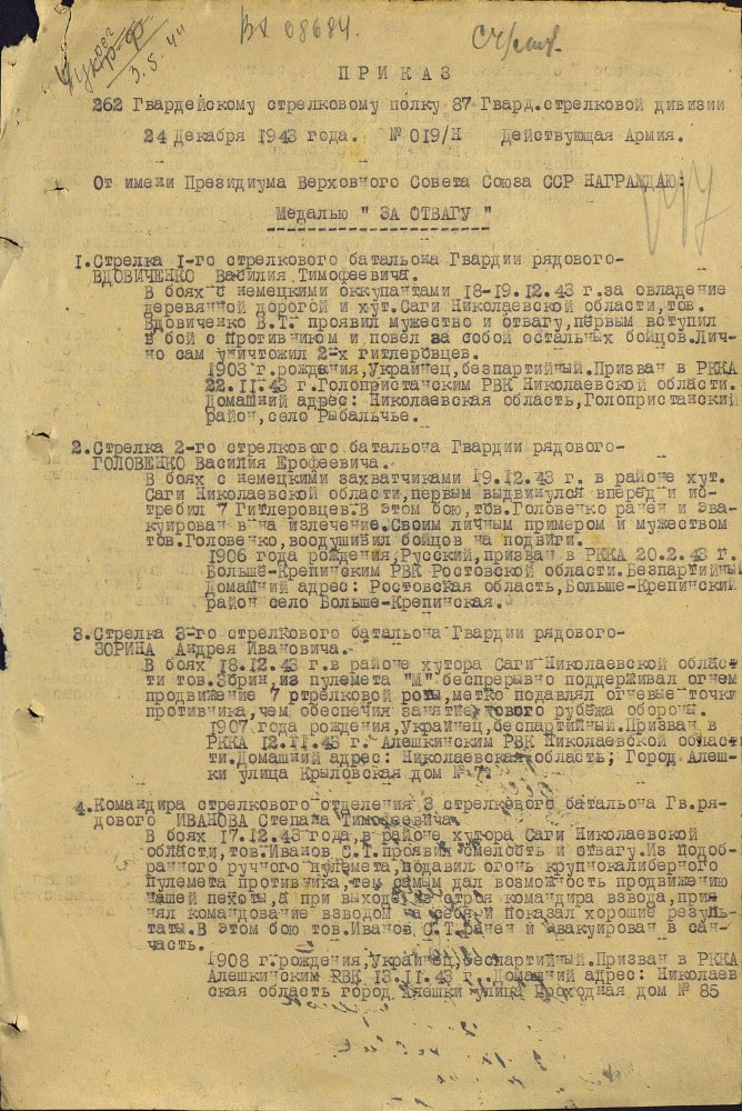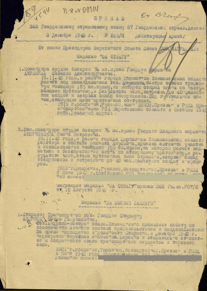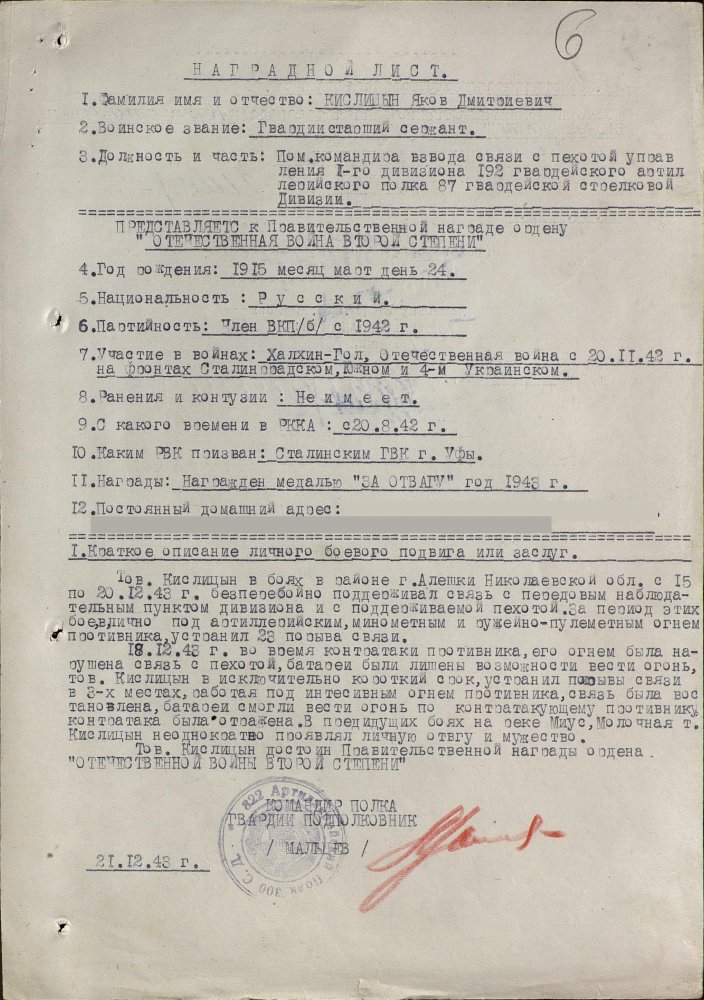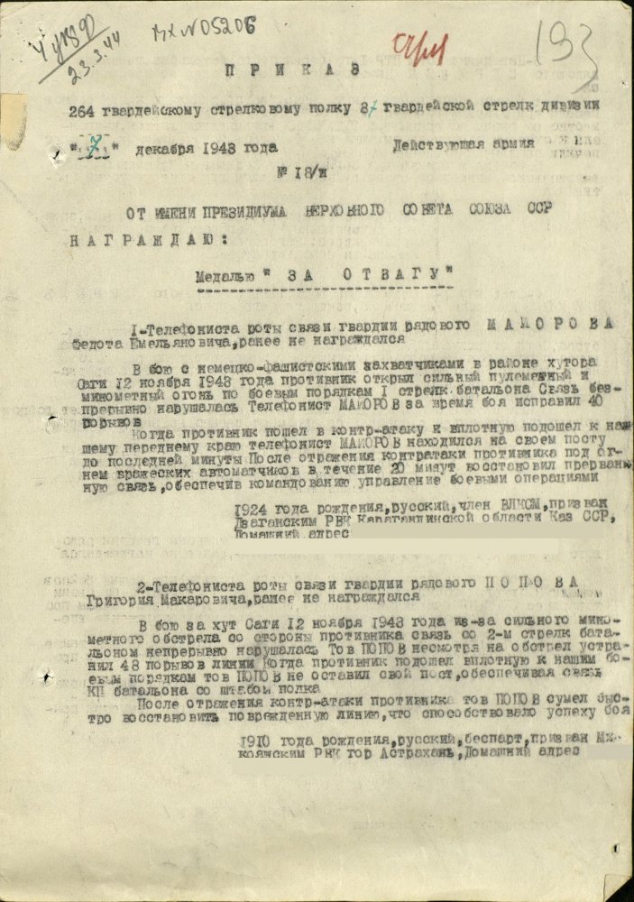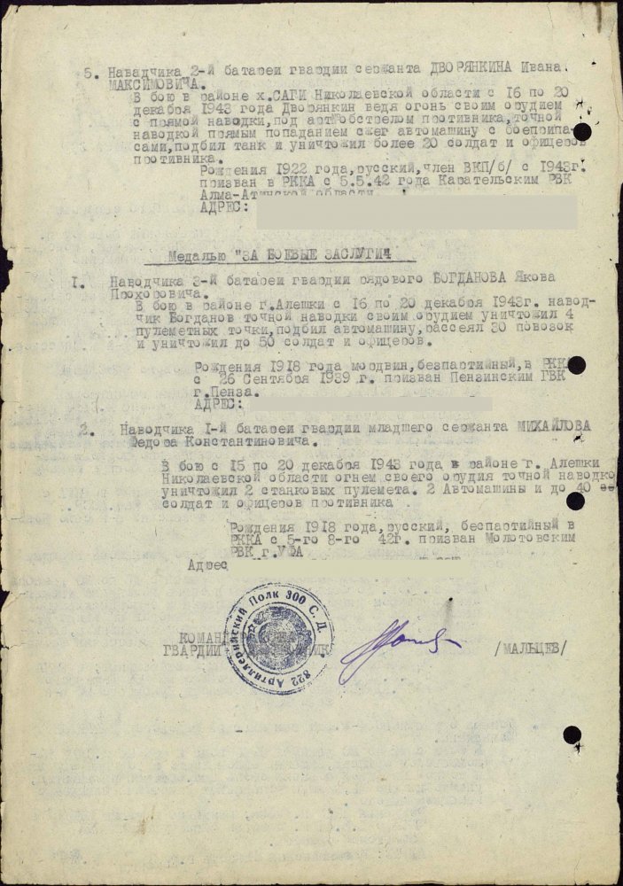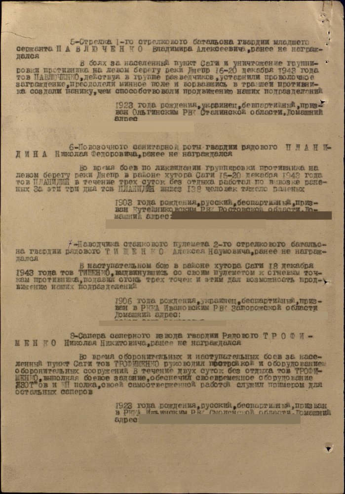 Продолжим по наградным документам за ликвидацию плацдарма. Сегодня 87 гвард. стелковая дивизия (95 листов) и 2 гвард. мехкорпус (112 листов) Опять сбитый Хейнкель, подорваннный мост через Днепр(?), потопленные катера при попытках высадки десантов... По летчикам, пересмотрел документы 8 воздушной армии за декабрь 1943 и январь 1944 - нашел по нашему плацдарму только 2 листа. Зато полно награждений за этот период по Никопольскому плацдарму.