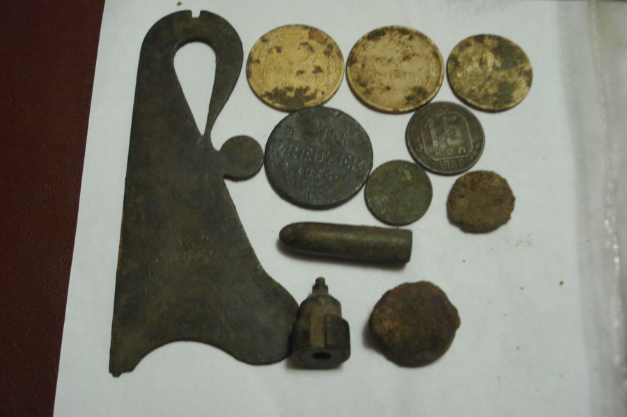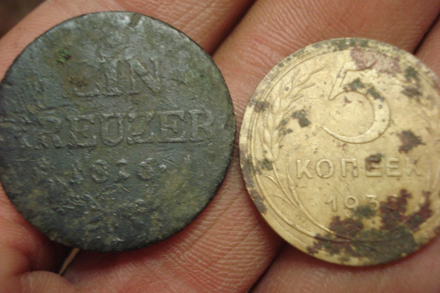 Сегодня какой то дурной день . Решил копнуть с двух мест ретировался . На первом пошел на пол часа на разведку ( не очень ) , иду к машине , глядь "титушки" в машину заглядывают . Подождал пока уедут и съеб.... . На второе место приехал , вышел с лахами , смотрю с камышей охотник вышел ( . Показую с далека , что стреляеш ? Да . Ну стреляй , сел и уехал дальше . На третье место приехал наобум , не был там никогда (хотя и проезжал мимо с копорями) . Встал , смотрю трое Асьководов вышли из леса , сели в таврию и уехали . Пошел ) , ходил бродил вышел к селу и давай там бродить . Через пару часов пришли двое : лесник и хозяин земли , где бродил . Лесник , был с лопатой . Сначала подколол , что помочь выкапать , а потом где рарешение ? Говорю , какое нах. разрешение , я уже устал кататься , а вы всю масть сбиваете ) . Вообщем поговорили нормально , хозяин разрешил *(только ямы закапывай) . Короче лесник остался не доволен , чужими ямами , все мне их тыкал . Находки так себе , копал все подряд . И железо тоже кил. 10 , хоть так . Порадовали две монетки : 5 коп. 1935 г. и краузер первый раз попался . Какие то две непонятки , большая и маленькая круглая . , сфоткал отдельно . Может кто подскажет , что это было . Всем добра .