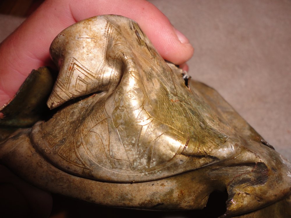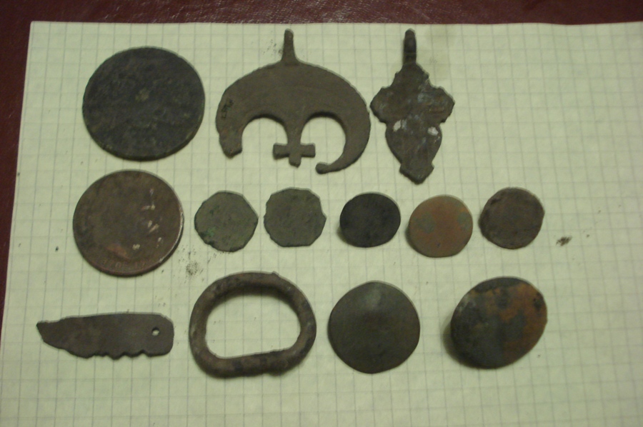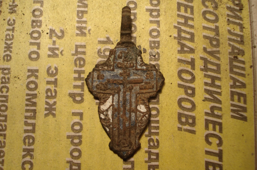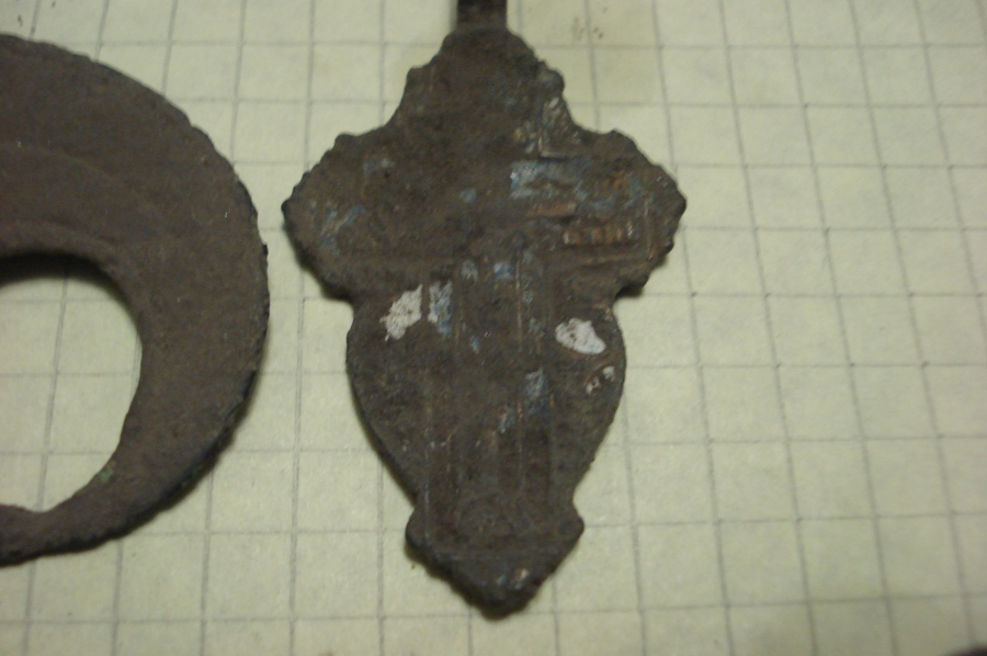 Вот моих немного,какая-то лапа,материал-латунь с по серебрением.Скорее что-то церковное,и скорее с подсвечника,но по картам церквей рядом не-было.Жаль состояние...Сперва принял за консервную банку. Чем богаты-тем и рады...