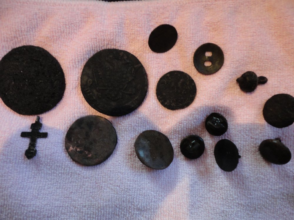 Вот мои находки за сегодня.Порадовал сохран монет.Думал,что пятак(залипуха)убитый,а оказался в идеале.Все находки с одной поляны.