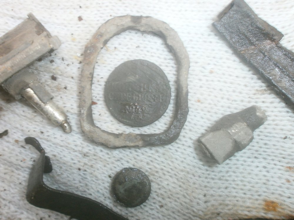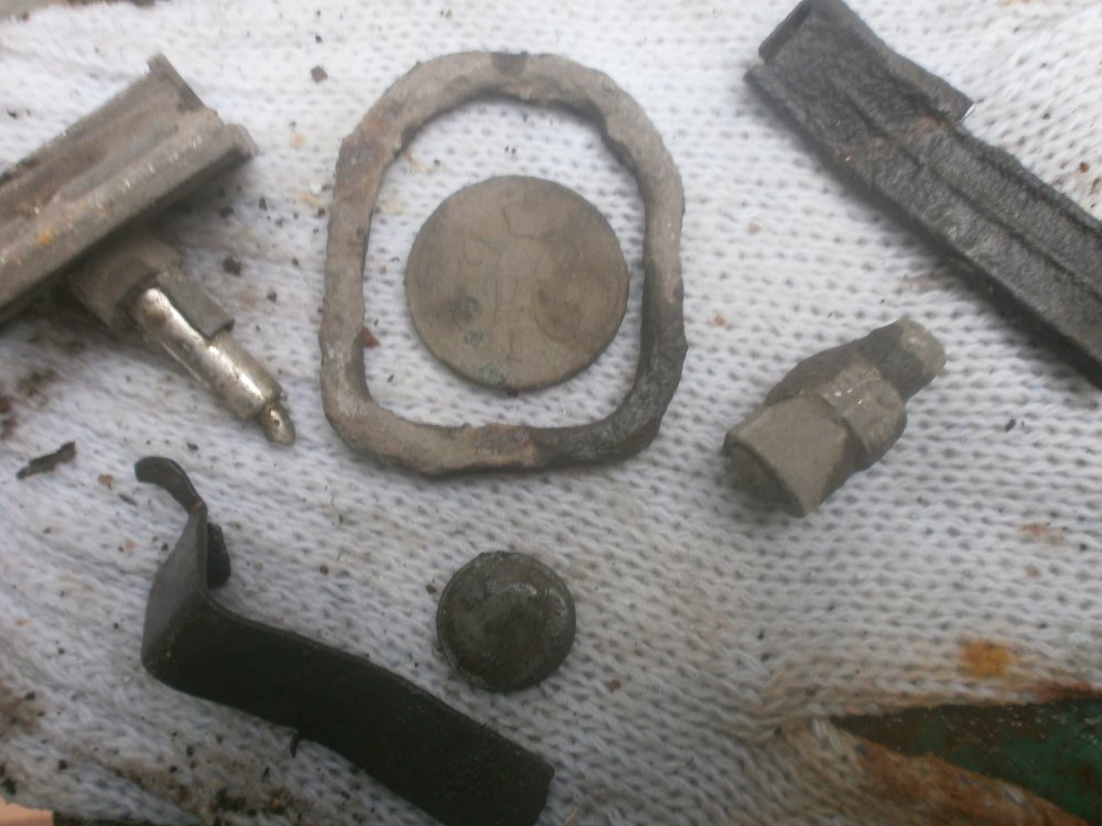 Поскуднели места Военных действий наших, выбито почти все, даже гильзы...чтоб чего то найти нужно на глубину уходить, и то не всегда помогает, так из найденного монета ранний совет ,очень маленький кулон с изображением "Божья мать не порочное зачатие" Сказали знающие люди( у нас в группе есть свой "капеллан") с ганс надписями (хотел сфотать но разрешение не позволяет(это та штука что возле монеты) Крышка с ганс котла стебель с Р_ПГ И не понятная чудо пряга ...Кому попадалась что за зверь кто знает????? Ну и штык так М.МГ временем зато кнопка работает и курица стоит....