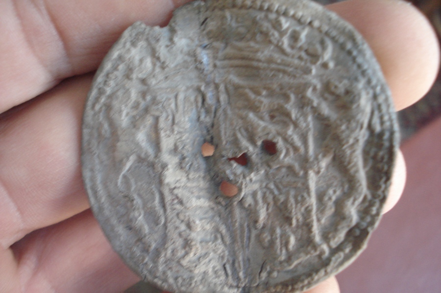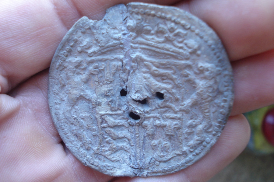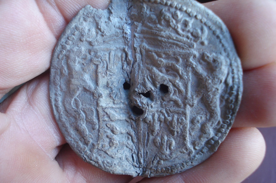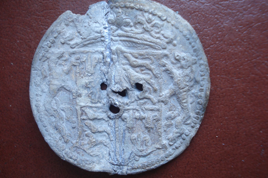 Конечно я не знаток геральдики, не ясно видно животное держащее щит слева, (должны быть единорог и лев). На фото, помоему, герб Англии, имевшийся у нее с 1399 по 1603 годы. Где три леопарда ("идущие львы на стороже") и три лилии («fleur-de-lis»). Вполне себе может быть накладка с мануфактуры какой нибудь, сумки, тары, а может быть пломбы с товара