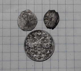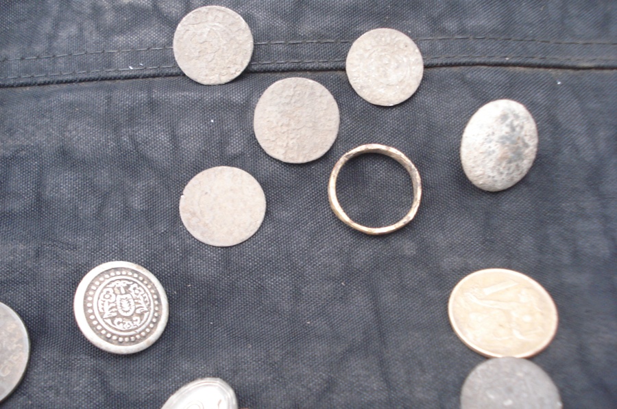 Монеты полтораки польские , казачки поднатаскали. Пуга вроде как современная , сердечко интересное но наверное прошлый век не старше. Ну и толпа у вас ! Городы копать не нанимаетесь ?