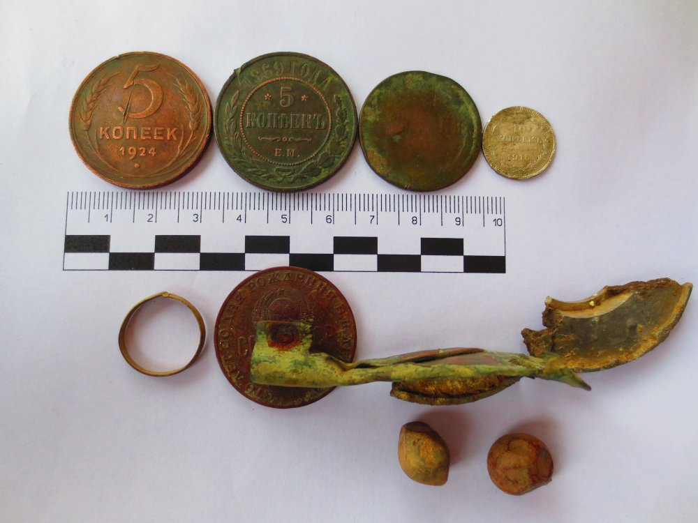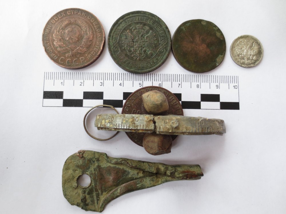Испытывал по новому, вроде бы знакомый режим. 5 копеек 1924 г., 5 копеек 1869 г., "обмылок" с копейки, 10 копеек-билон 1915 года, хуторской ключ, колечко. Советский рубль не в счет, в виду современщины. Выхаживал битое место. Хороший такой режим. Шкалу с дистанционной трубки собрал случайно. Ошметки лежали в радиусе метров 50-ти. Видать обстреливали, потому как поражающие элементы так же в наличии. Кто знает, к какому периоду относятся алюминиевые шкалы на шрапнельниках?