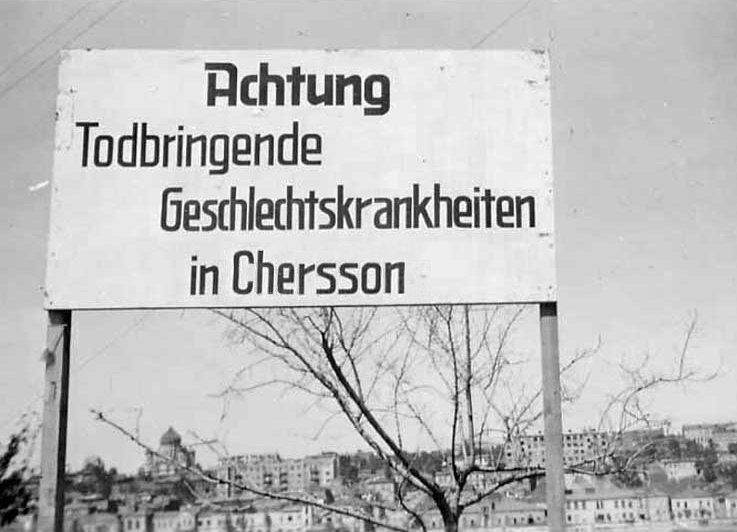 Ja, ja! Alle Bewohner des Dorfes - in die Kommandantur, auf die Registrierung! Schnell - schnell!Это к вопросу о сифилисе....Перевод:"Внимание!Опасность заражения венерическими болезнями в Херсоне!"