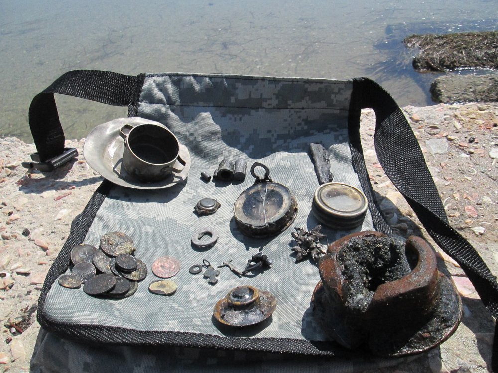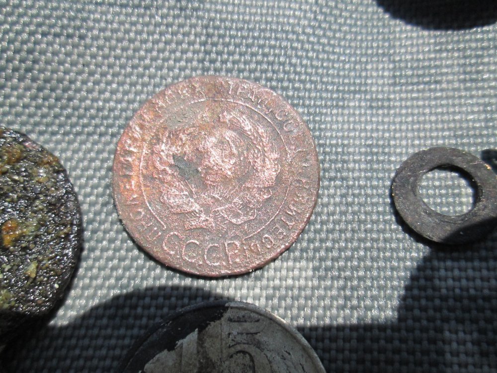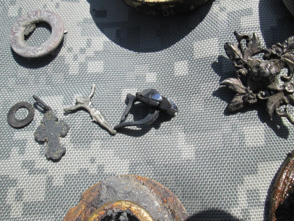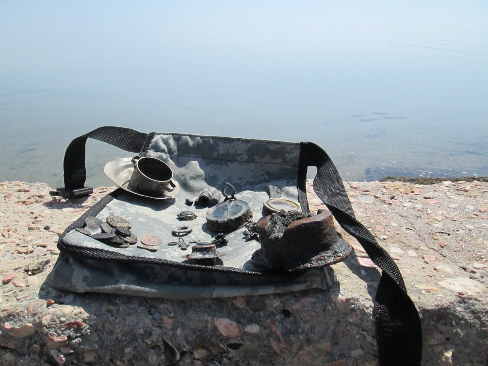 Погода была прекрасная, находки были... разные. Копейка 1893 года - стоимость ее гуляет от и до, в общем непонятна. Патрон интересный, вестерн, 1914 года, донышко от патрона Элем, серебряное колечко разогнутое, 84-й пробы, нательная медная ладанка начала 20-го века . попался также диск от танкового пулемета Дегтярева, и под занавес красавица-гадюка, вот врут, что не любят они воду, сидела практически в озерце, вела себя агрессивно. Будьте осторожны!