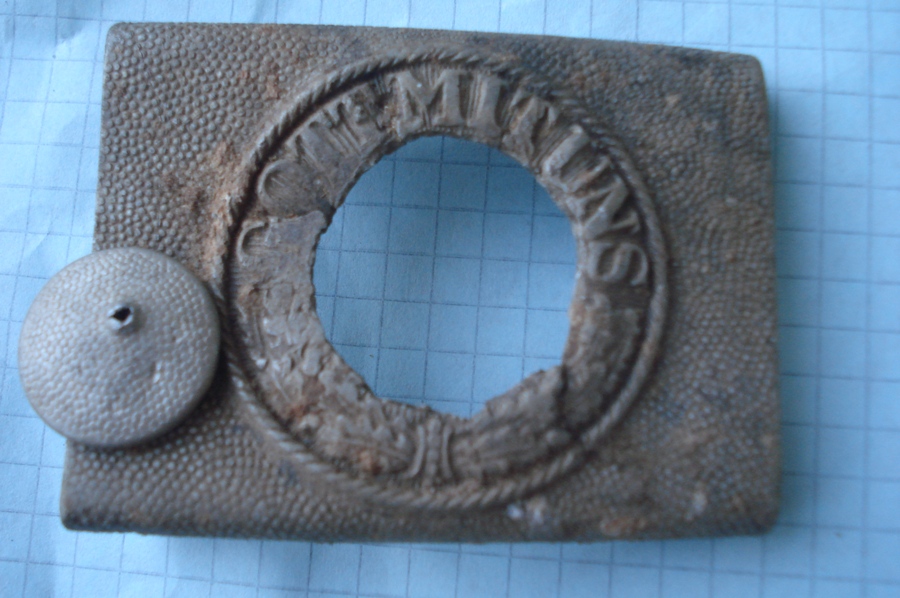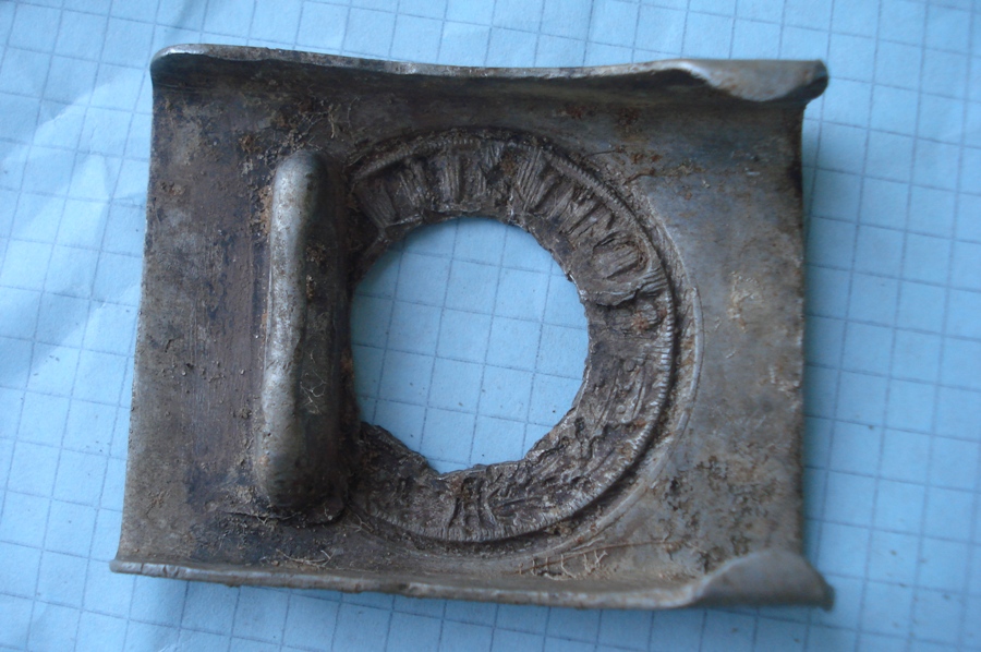 Это называется бляха-партизанка. Немецкие ремни были популярны. В том числе и в армии. Ну не будеш же ходить со свастикой, потому и вырезали - затирали.