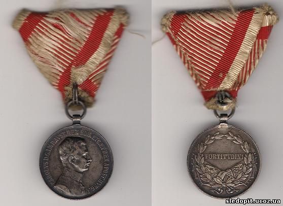Вдогонку по медали:Со смертью в конце 1916 года старого императора возникла необходимость изменения дизайна награды. Новая версия была опубликована 4 апреля 1917 года в 18-м номере «Normal-Verordnungsblatt». Вокруг изображения Карла І в фельдмаршальском мундире помещался латинский текст «Карл милостью Божией Император Австрии, Король Богемии и т.д. и Апостольский Король Венгрии» (CAROLVS D.G. IMP. AVST. REX BOH. ETC. ET REX APOST. HVNG.). На реверсе надпись заменили на латинскую (FORTITVDINI). http://ah.milua.org/medal-za-xrabrost