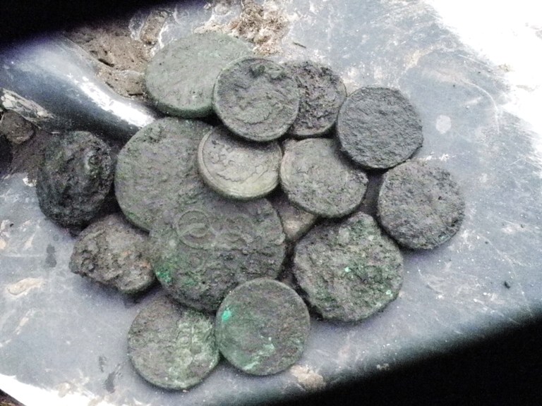 Всех приветствую...Давно не писал отчетов, да и выбираюсь на коп не часто...Нет настроя,драйва...всё стало здесь мне чужое... ...Выезд готовили долго-то у меня из-за работы не срастается,то у напарника Мальдивы и Анталия...А вы думаете они в Крым отдыхать ездят ?... Наконец то всЁЁЁ -нас манит дальняя дорога (хотя не так и далече ..200 км.от базы..Ярославская губерния)...Добрались на заре...потом еще вёрст 15 по убиенной лесной...просеке.. И вот она -знакомая избушка егеря (2 года здесь не были)..и зачетные места (когда то хабарные...но порядком нами выбитые) ..Почти рядом место,где поднял приличную кладуху (была тема на Виоле..)...но и здесь есть что поудить и, главное разведать места на"потом"... С классным настроем выгрузились -вокруг золотая осень,деревья стоят с нарядной листвой...ляпота...,подремонтировали печь,навели порядок в избушке ,снарядились и уже были готовы рвать удилА...И тут начался полный...катаклизмЪ... Налетевший циклон (росгидрометио-отстой!) погрузил нас во мглу (и это утром!)....Всё выло и стонало-деревья скрипели как кровати в общаге ...Снег не просто повалил-началась самая настоящая пурга...За час уже сплошной "новый год" в 20 сантиметров... Мы поняли что застряли тут на долго...замаячила перспектива кому то "шлёпать затрахтором"...и то, если еще найдёшь трезвого тракториста (бухает крепко народ..)...Скоротали время за трапезой-не пропадать же напиткам...Немного утихло, снег почти угомонился...но мысли о копе на полянах вдоль речки пришлось отбросить... Тогда то и вспомнили про добрый ,верный шурф (местяк от богатого фундука еще можно было примерно определить..) ..Расчистка и подготовка заняла где то часик..и уже через минут 20-ть место порадовало приятной монеткой -снежным "Ализеевичем"... Фоткал не много..руки в грязи и в снегу ,да и с ёлок мело еще прилично... Копнули около сотни монет (еще половину фундука и не дорыли-условия сложные, реально тяжело..) -от Петра до Александра 1-го..Чешуи ,как ни странно попалось всего пару штук...почти не было предметов религиозного культа... Сделали вывод,что попали на кабак или лавку... Порадовала небольшая кладуха-закладуха...монет на двадцать...И что интересно-и клады ,что раньше нашли и эта закладуха обрываются в 1812 году... Видат, только пошел хипишь " Наполеон Москву пожог...убивают -насилуютЪ..", народ в панике начал деньгУ ложить на схрон в подпол (медь),серебруху-за пазуху и "делатьноги"... (нет что бы и серебро там рядышком прикопать...кто его тронет... )..Ну и остальные монетки есть интересные - пятаки, двухи,мелкота Екатерины , Елизаветы, Павла...Створку складенька интересного тоже буду чистить... Умаялись потом ямищу приводить в порядок... Ну а как мы выбирались и как доехали в "День жестянщика" на базу-это уже отдельная история.. Всем Удачи...и хорошей погоды над головой...