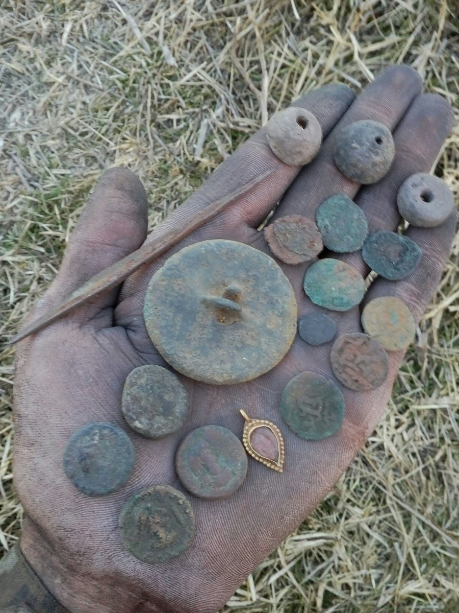 Всем привет, теперь у меня на мечту меньше. Нашлось мое золотце. Остальное по фото... Античних монет- 4 пока не определил. Золотая подвеска -1думаю антика. Зеркало- 1думаю антика. Татарки- 8 наверное орда. Ну и всякого разного. Империя, совети.если комуто надо будет добавлю фото. Для чего кость со свинцом?