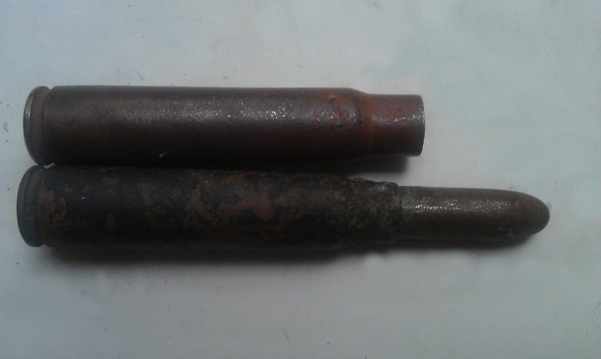 У меня валяется патр, найденный на херплаце. Маузер 7,92 один в один, только гильза короче. Определили как "бельгийский маузер". Один такой попался на сотни обычных. Пациент - крайний слева. На фото- макеты, если что.