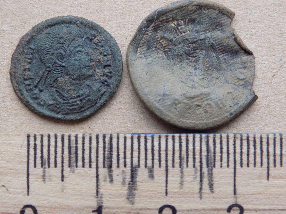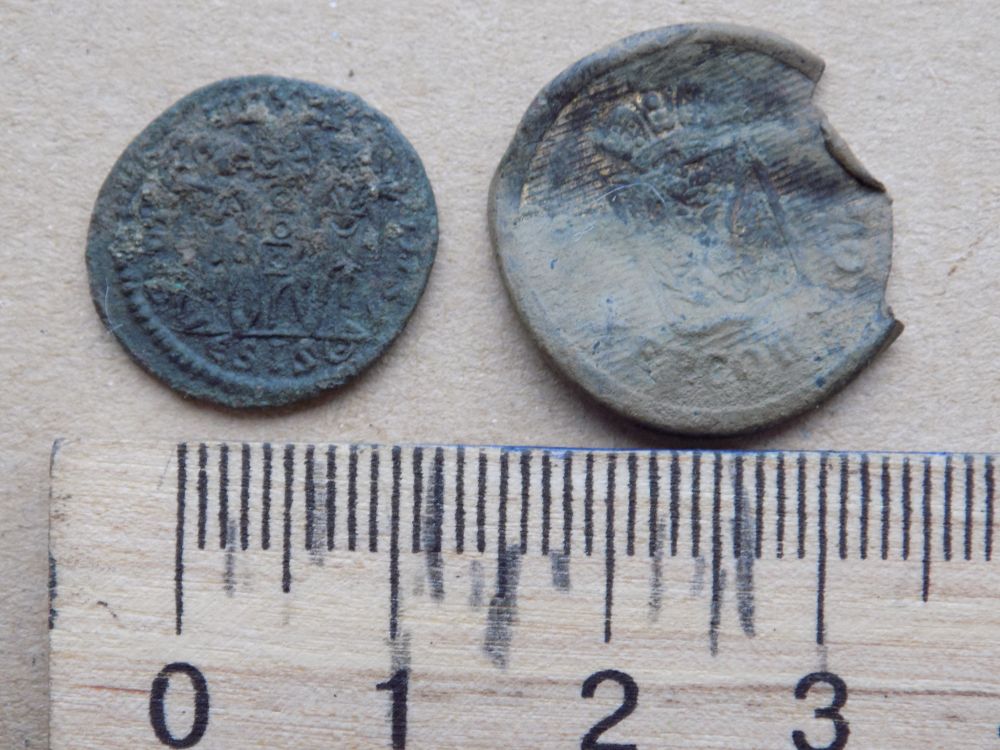 Вот и я кашляя, чхая и громко пукая выбрался наконец сегодня поковырятся в земельке. Нарыл жменьку поздних и ранних советов - можна было в свое время бутылочку пива купить и детям на мороженое еще осталось бы. Немного хуторского мусора в виде пряжки и нескольких лысых пуговиц (не фоткал). И под конец выскочили пару монет похоже как денарии хотя могу и ошибиться и огрызок Херсонской пуговки. Серебрянный обмылок не фоткал там только по размеру и еле видному профилю императора можна догадаться что это монета. А вот бронза неплохо сохранилась правда закрадывается сомнение что это денарий - кто в теме подскажите чья монетка.