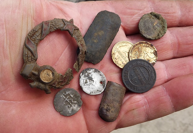 Немного. 20 копеек и большую татарочку подчистил в адской смеси , не люблю грязное серебро. Первый раз попалась застёжка , правда часть её , с серебра , обычно посеребрённая бронза , наверное если бы не отломалась то не потерял бы , ну и отломанное серебро никто не выбросил бы .