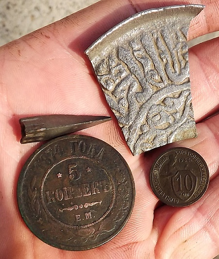 Это пятак 1869 - почти какалик, еле отдряпал от цемента 10 коп. 1852 г. тоже кач. не очень. Остальные предметы - обломки подсвечника и музыкального иснтрумента. Вензель - наверно Фейновский, хотя не уверен. Уголок коцнутый - наше дело, ручка вверху целая. Вообще удивительно как это сохранилось. Свиточек - с надписью ИНРИ , одна из немногих целых вещиц. Это лишь малая часть того, что там было найдено. Малая, потому что первые находки, потом просто устал и отложил фото не на долго. Там ещё есть кусочек расчёсочки, пробочка от духов вроде или от графина с вином (пили они мадейру, лейба от сгоревшей бочки тоже была там найдена) и куча всякого латунного лома, есть нейзильбер, листья дубовые - в общем тьма находок. И лежит всё аккуратно сложенное в керамической посуде на глубине около полу метров, кувшин с советами чайный заварник медях и пол чайного никеля, тоже закопанное. Почему зарыл клад? Да потому что вынужден был покинуть место жительства - из за войны случившейся, срочно нужно было выехать за границу. А всё накопанное обратно закопано... Так что лежит оно там всё, покоится рядом с историей. Кстати, на ноже , где собака - такое ощущение, что это запёкшаяся кровь, кусок от ножа был найден целый, но с дуру (находки первые опыта нет) подумав что это контакт от трактора какого-то начал гнуть на предмет понимания - медь или фуфло какое ( тоже лом сдавал на хлеб на воду) ну и поламал свой первый раритет