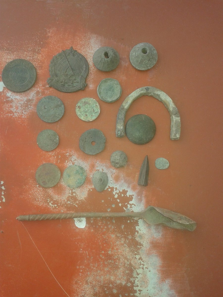 Был у бабушки в деревне помагал по хозяйству в конце дня узнал что напротив был хутор...час походил..нашел всяко разно..но сохран земельный...песок рулит.... отот комочек то очень интересная медная хрен..почистчу супер находки пере выставлю...