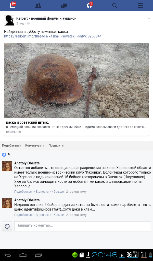 Написал разложив по полочкам инфу дальше некуда..... Ладно, повторюсь с уточнениями - Закон Украины «Об охране культурного наследия», определил ЛЮБЫЕ места боевых действий и ЛЮБЫЕ места захоронений погибших, которые погибли в войнах как исторические объекты культурного наследия. Не все эти места известны и постоянно находят новые - поэтому НЕ СУЩЕСТВУЕТ и не будет реестров с отдельными одиночными захоронениями и местами локальных боевых столкновений. Именно поэтому законодатель и предусмотрел норму закона регламентирующую поведения человека нашедшего такое место. Стаття 36. ЗУ Про охорону культурної спадщини. Припинення земляних робіт у разі виявлення знахідки археологічного або історичного характеру. Якщо під час проведення будь-яких земляних робіт виявлено знахідку археологічного або історичного характеру, виконавець робіт зобов'язаний зупинити їх подальше ведення і протягом однієї доби повідомити про це відповідний орган охорони культурної спадщини, на території якого проводяться земляні роботи. Не прекратил раскопки и не уведомил о находке - уголовная ответственность по ст 298 ККУ. А если там ещё и боец, так 297-ю статью ККУ тоже никто не отменял. А так, поступай как знаешь. Мы все сами выбираем дороги которыми идём. Понятно, что кто копал, так и будет копать. Просто не вводи людей в заблуждение, что коп по местам боевых действий, и особенно раскопки где присутствует боец, без официальных разрешений - не несёт за собой наказание и никаких нарушений нет.