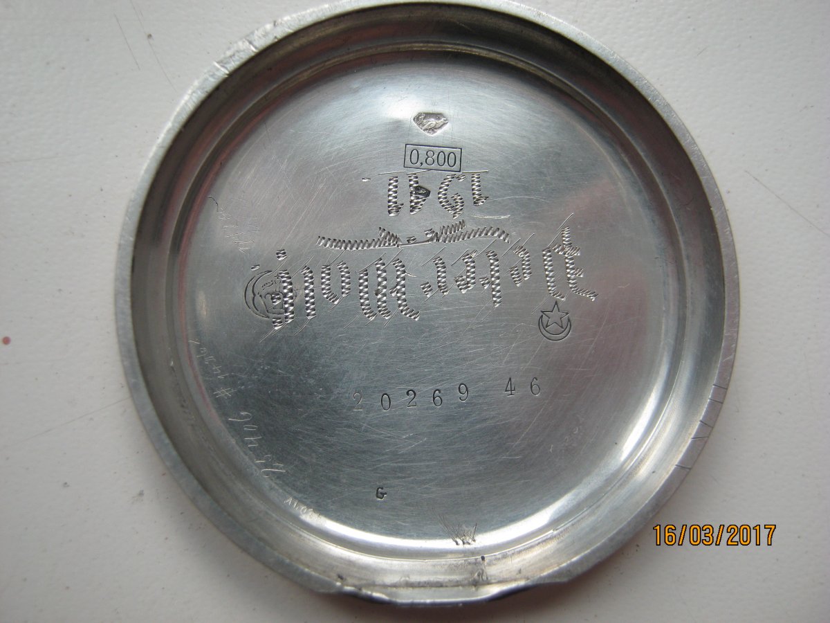 Нагуглил - Данные карманные часы сделаны из серебра 800 пробы, что подтверждается знаком качества Германии - клеймо в виде полумесяц и корона. Также это подтверждается клеймом глухаря и клеймом 0,800 - Швейцарское качество. Похоже часы - Longines . Ф какие буквы под вторым глухарём? J...T ?