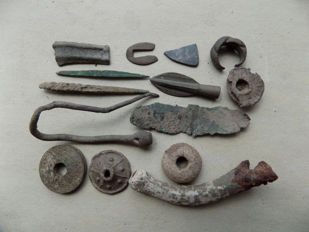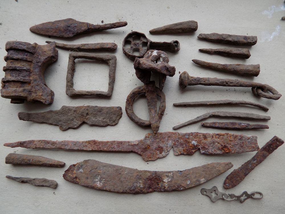 Похоже весенний сезон закончился - трава по пояс. земля камень... За пару выходов насобирал вот такую солянку - в принципе ничего интересного только прикольная бронзовая иголка (булавка?) с сквозным отверстием в головке жаль погнутая, наконечник (такого типа еще не попадался мне) и прясла похожее на летающую тарелку и бронзовое - тоже таких еще не было... Нижняя загогулина бронзовая, думал обломок псалии, но остатки ржавчины указывают на то что может это кусок гарды ХО? И похоже наткнулся на стоянку по КР - обломки ножей проколки и остатки замков все из железа - та запчасть что по средине сверху с четырьмя квадратными отверстиями определили как остатки замка по КР (уже выставлял раньше) все найдено компактно, там же найдены монеты Киевское подражание дангу хана Джанибека Золотой Орды.