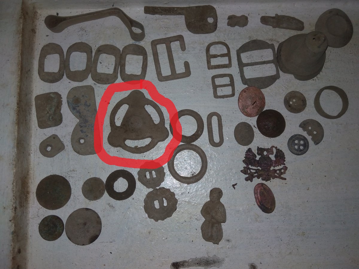 На крестообразном предмете стоит клеймо в виде стрелки, таким символом клеймилась армейская амуниция и предметы униформы английской армии периода 2МВ. Возможно, что этот предмет имеет отношение к Англии, тем более, что среди находок присутствуют и английские пуговицы.