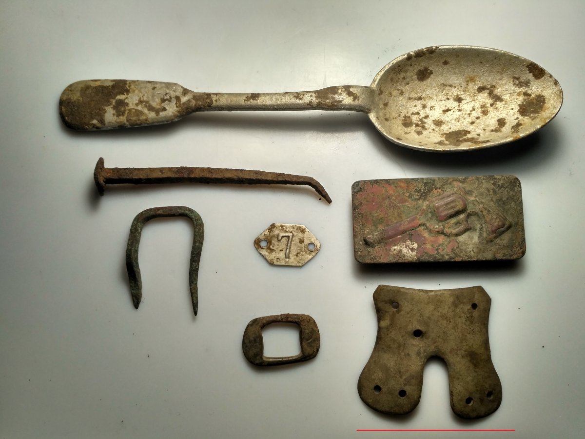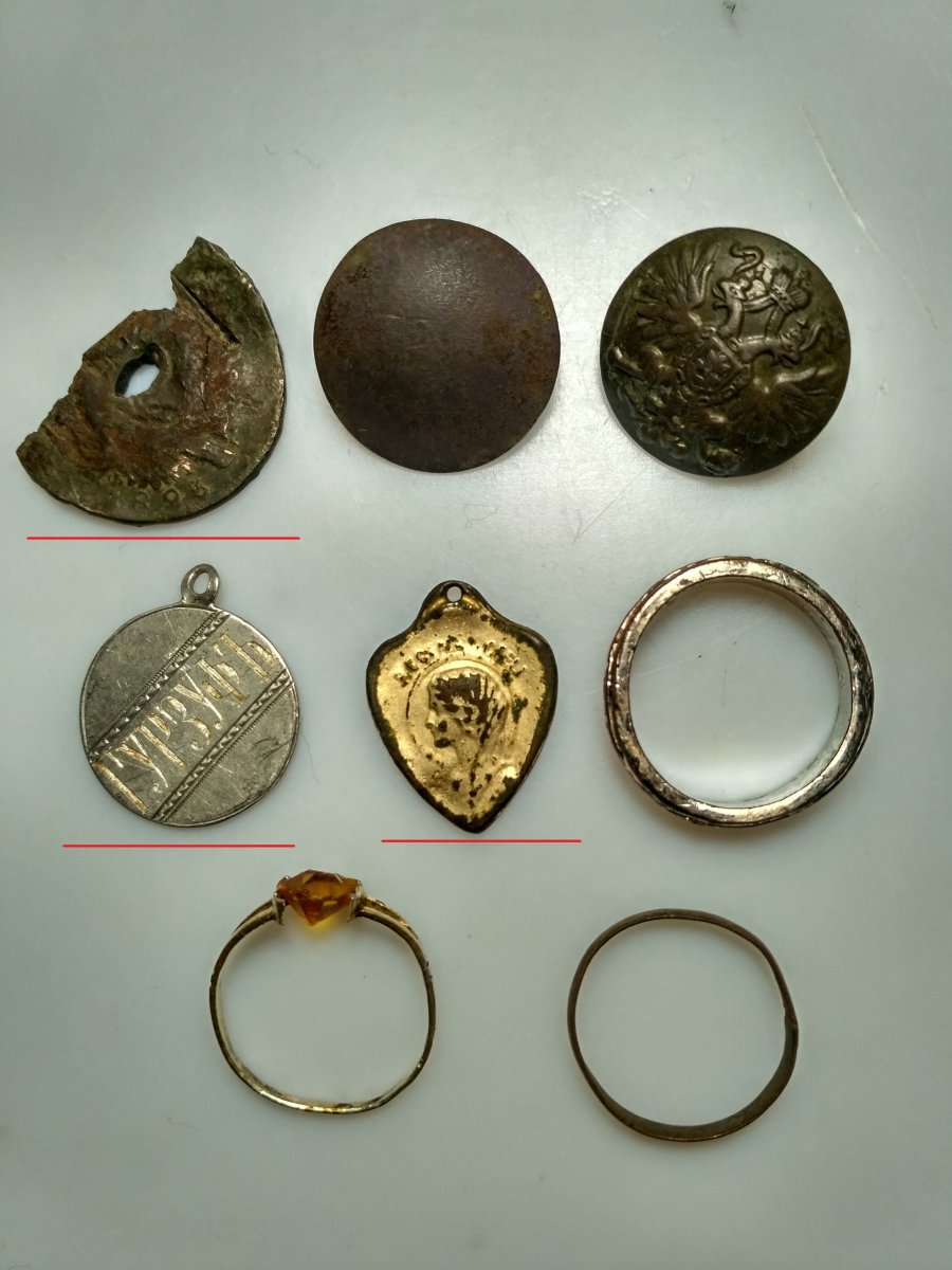 Всем доброго времени суток, вот тоже вырвался "немного" покопать, и по традиции фотоотчет: P/S подскажите по выделенным кулонам, "огрызку" монеты, цепочке и на последнем фото тоже непонятка, думаю что украшение с одежды.