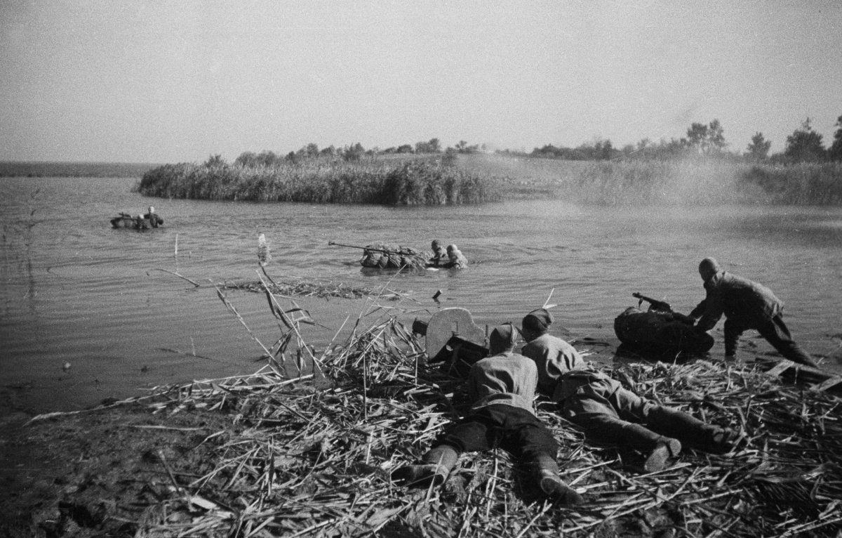 Это херсон ,область или ? Советские воины с боем переправляются через Днепр на подручных средствах. Переправу прикрывает пулеметный расчет «Максима» лейтенанта А.М. Максимова: 1-й номер старший сержант Сергей Иванович Жуков, 2-й номер старший сержант Анатолий Николаевич Тревогин