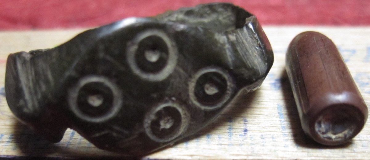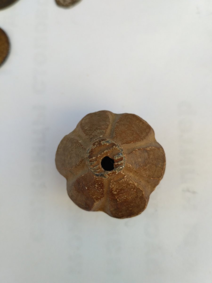 Пряслица наверное тоже пытались украсить солярными и другими орнаментами, вот слева в виде маленькой четырехперой булавы - к стати отверстие тоже не по центру. DSCN0203.JPG