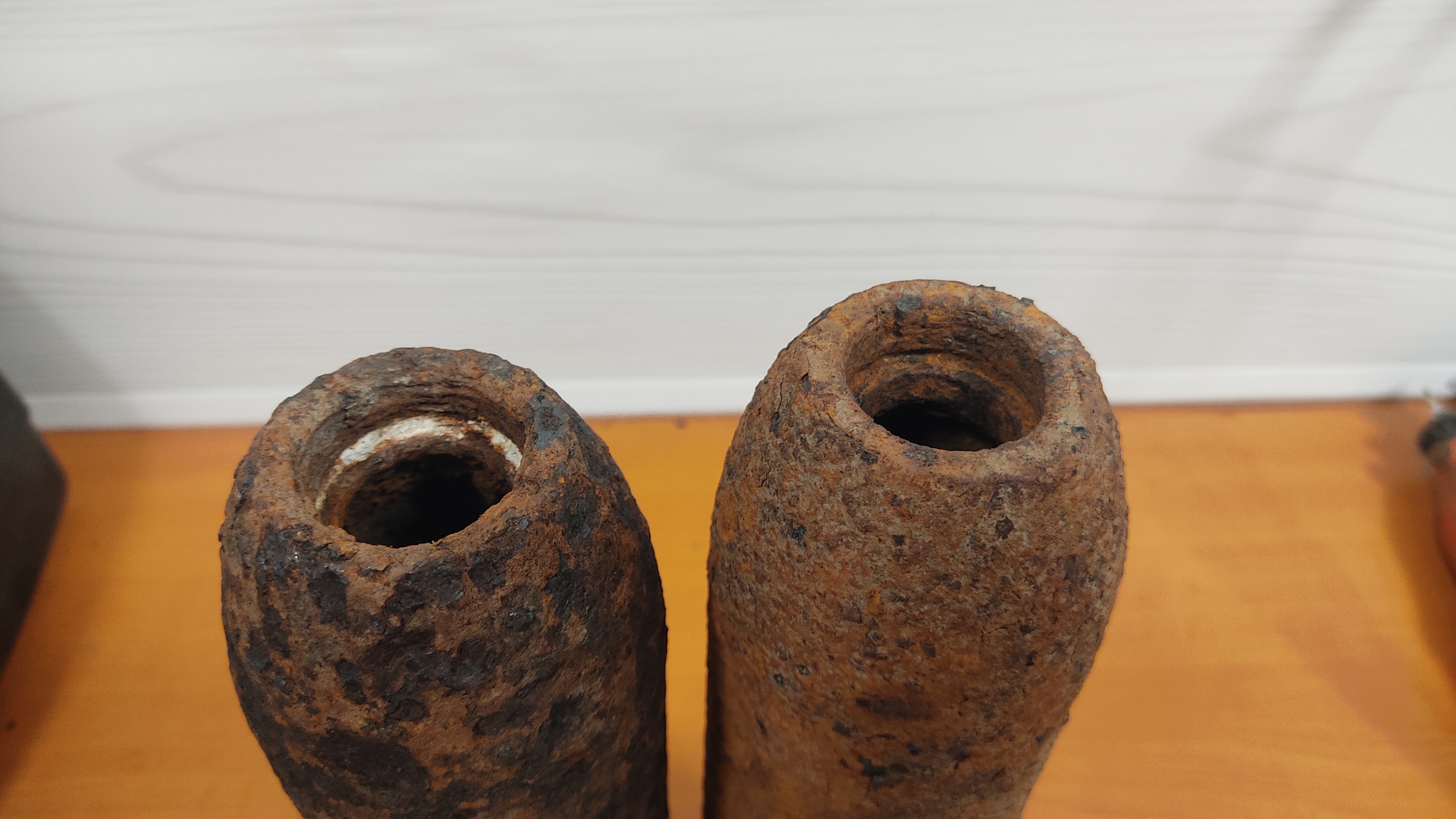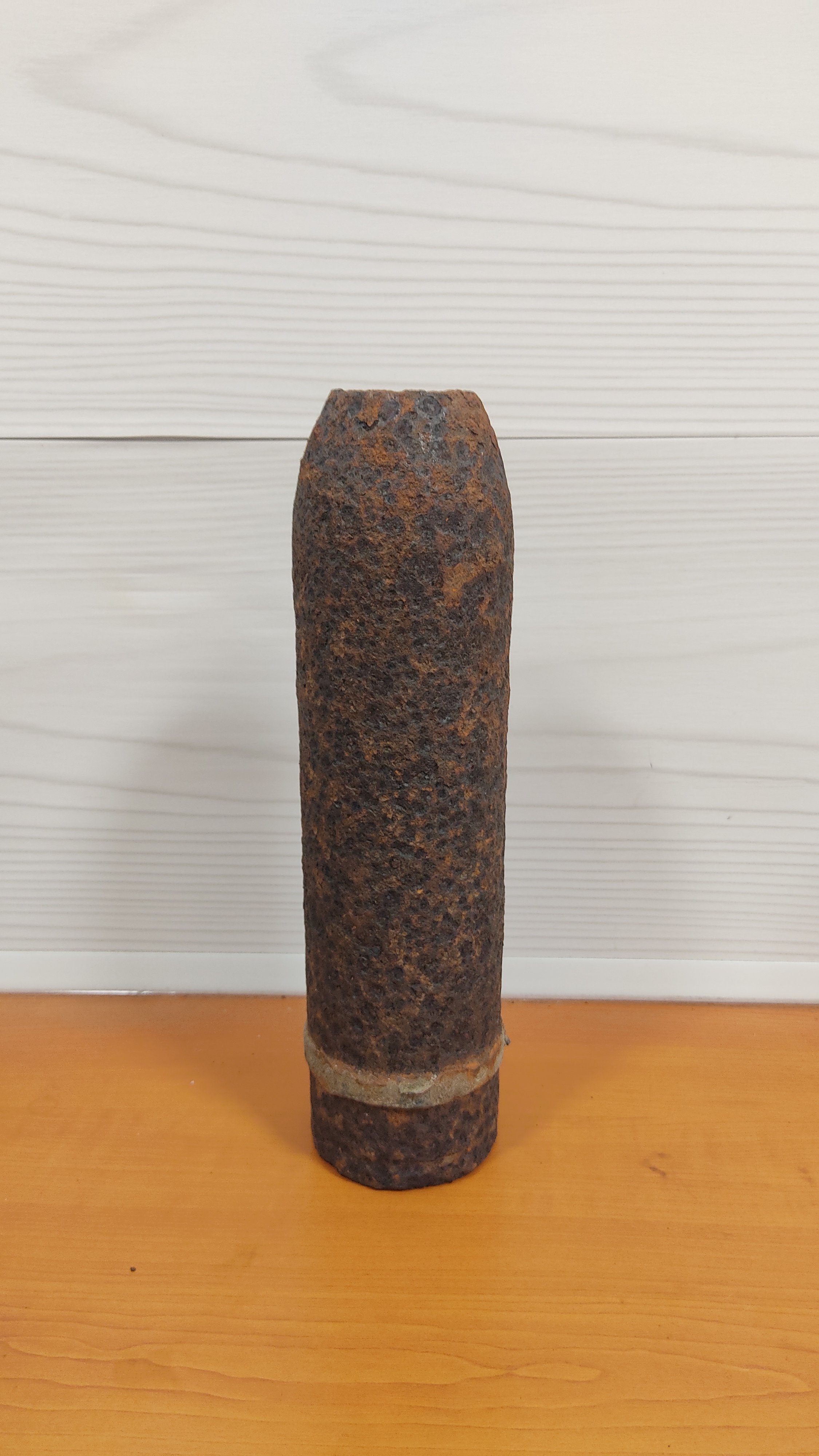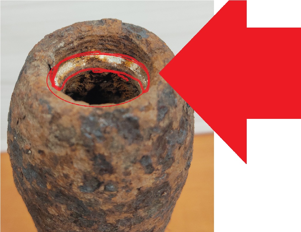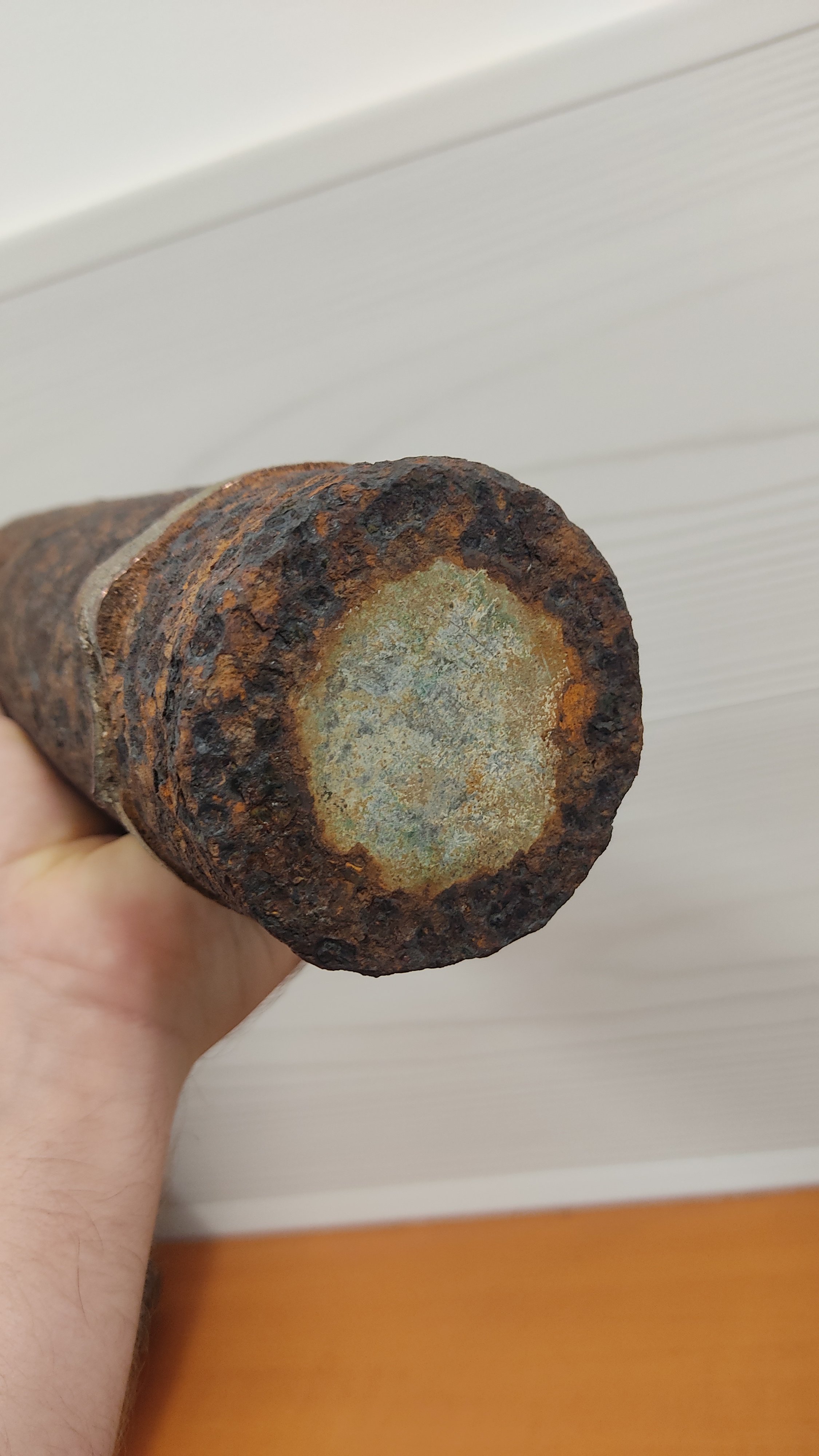 Русские снаряжали снаряды хлорпикрином. Они без дисков снизу. Снаряды с фосгеном и синильной кислотой получали из Британии и Франции. Это французская болванка. Белый диск скорее всего окислившееся олово, которым припаивали диск на французские гранаты. Химическая начинка очень сильно разъедает металл, поэтому посмотрите на состояние металла внутри.