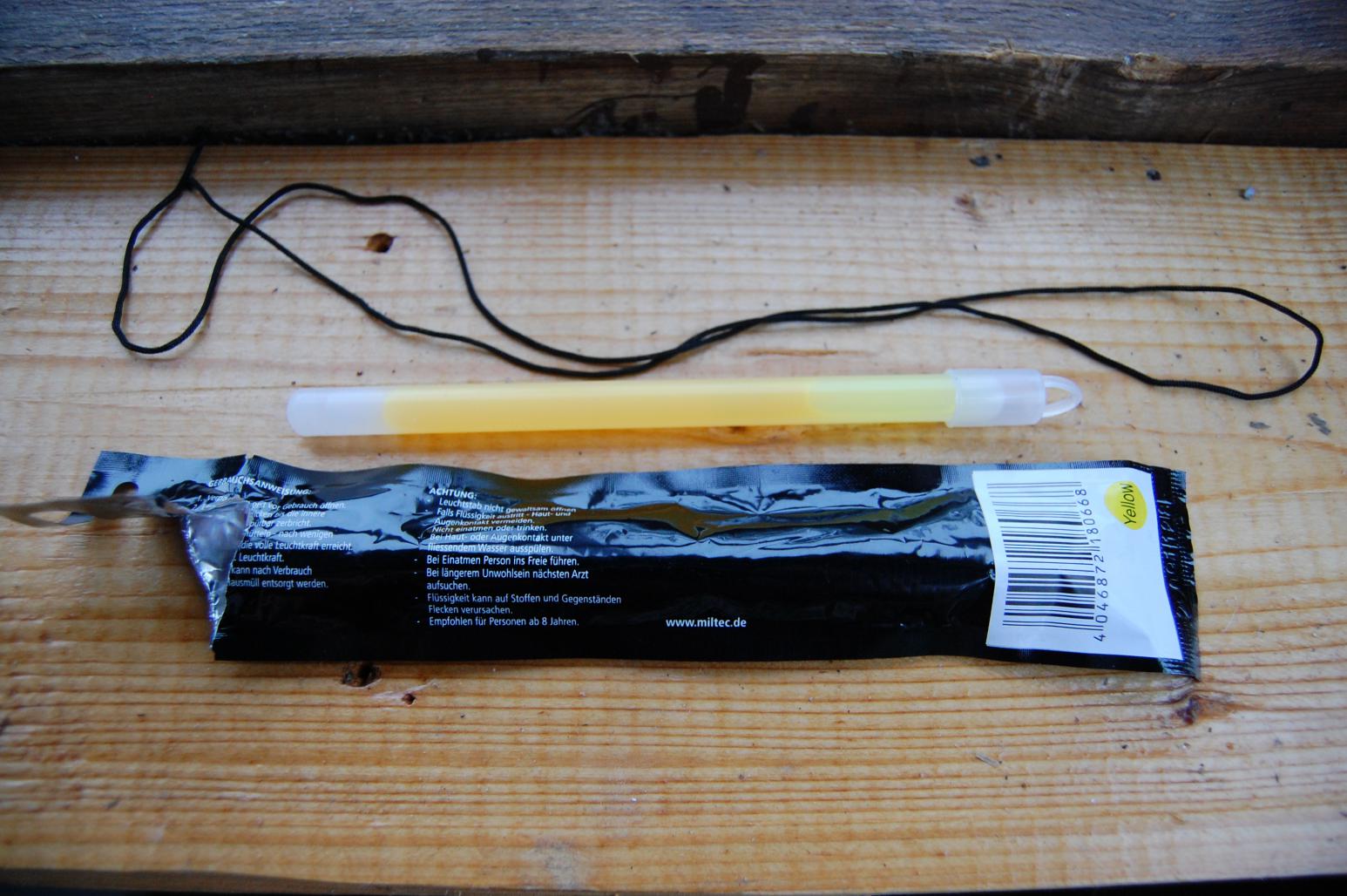 2. Химический свет Mil-tec Lightstick Large (Германия) "Цвет" и наличие "палочек" хим.света: - Инфракрасный - 5 штук Свет от этого источника невидимый невооруженным глазом. Для того, чтобы увидеть, надо использовать приборы ночного видения либо другой прибор, который различает инфракрасную часть спектра Время свечения - 6 часов Размеры - 150х150 мм Вес - 24 г (с упаковкой) / 22 г (без упаковки) Комплектность: - упаковка - палочка - химический источник света. Корпус - пластик. В верхней части - крючок для подвязывания на одежду/снаряжение - шнурок для крепления на одежду/снаряжение Цена: 30 грн/штуку