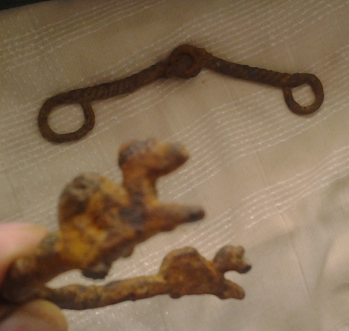 Первое - межевой знак, или да - геодезическая метка. Такое вмонтировали в старые времена в стены зданий при постройке. второе - петля с ворот, дверей или что-то подобное. Для запирания может. Типа как на фото, только самодельное и старое. http://images.rambler.ru/search?query=геодезический знак в стенах домов&utm_source=rambler-search&utm_medium=mixup&utm_campaign=images_up