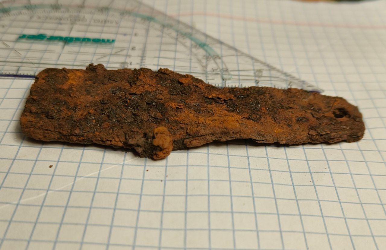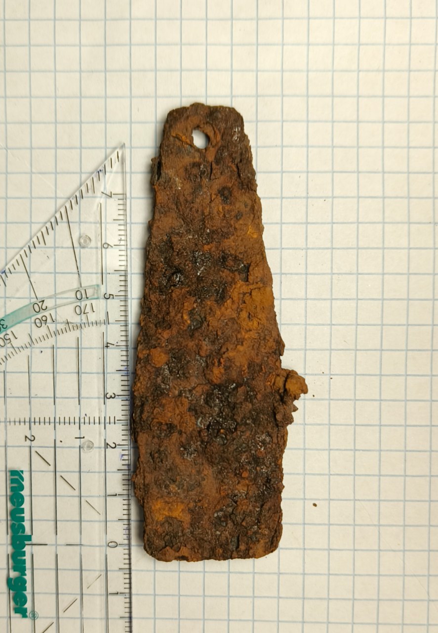 Вітаю! Знайшов в лісі на німецьких (як мені здається) позиціях такі "язички". Їх було 8 в одній ямці. Довжина – 6,5 см приблизно, Товщина – 2 мм. Усі вони мають отвір діаметром 6 мм. А також є два вигина, вони знаходяться одне біля одного, один дивиться на нас, інший від нас (на фото збоку видно ). Від чого це може бути, є якісь здогадки? Вдячний за будь-яку відповідь! З повагою.