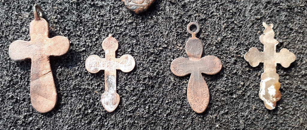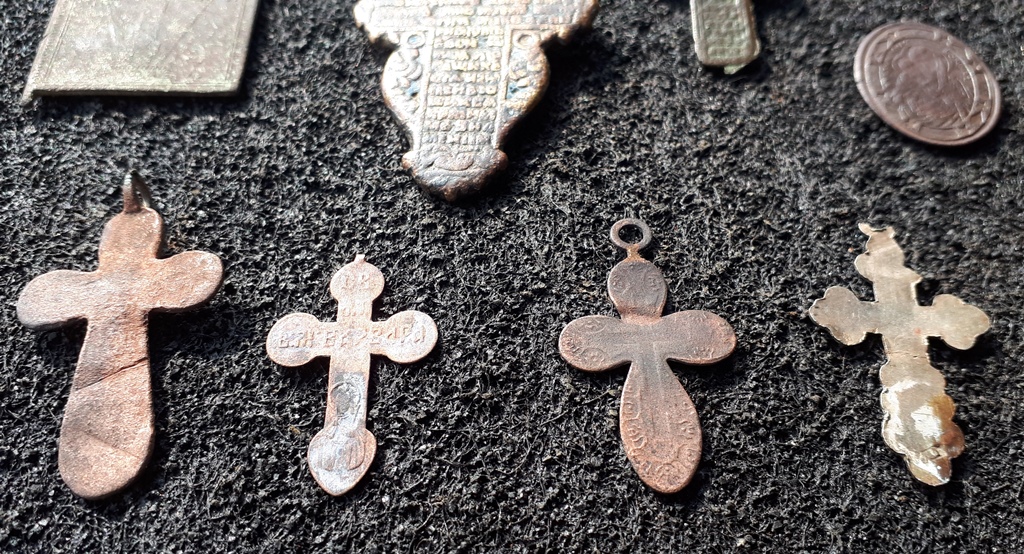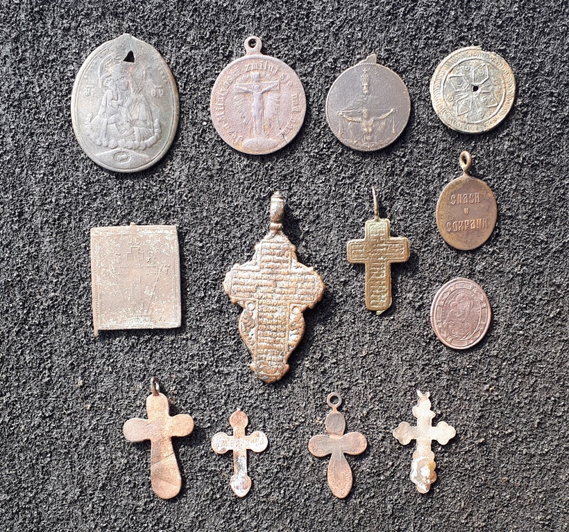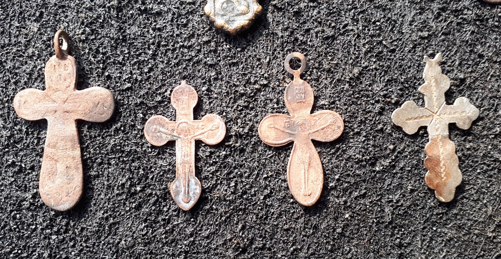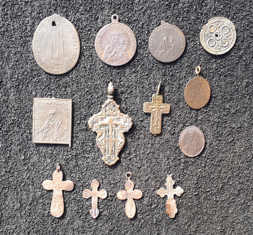 Доброго. Православні та католицькі натільні іконки (не ладанки!) та хрестики, наче створка маленького складня і обламаний дукач. Приблизно 19-початок 20 ст., майже все штамповка. Великий хрестик-листок ще хоч щось вартий, а інше бонусом до колекції.