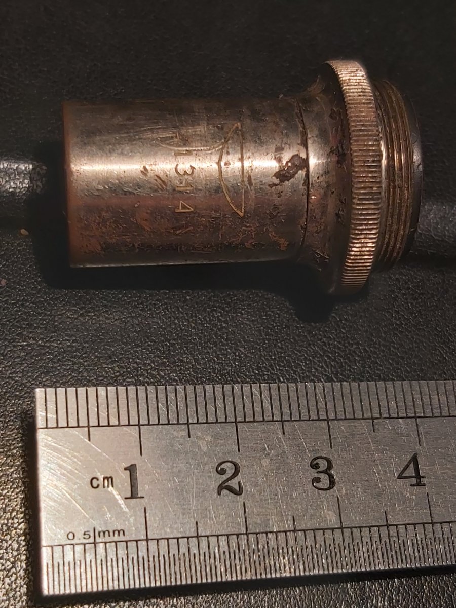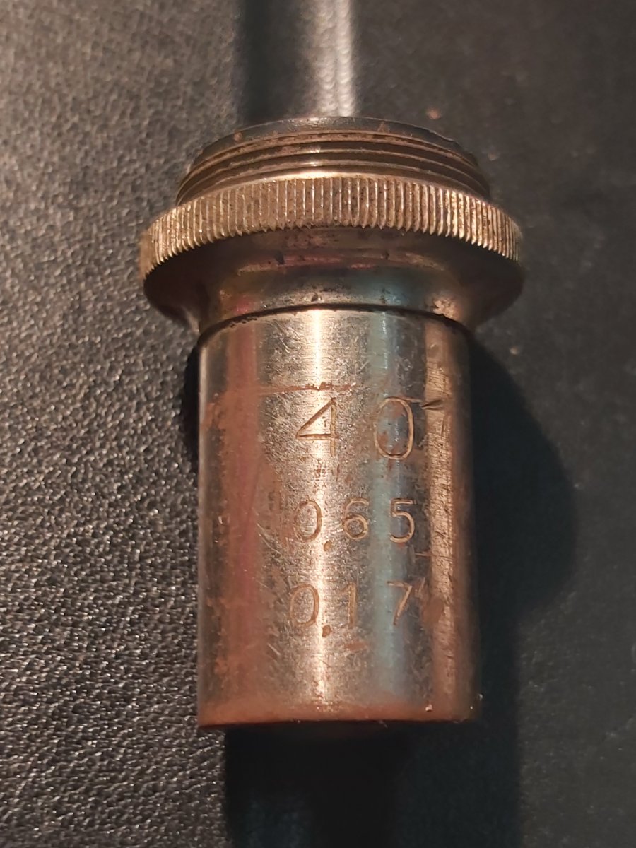 Добрый вечер! Точно так. Без серпа/молота и звезды (http://stk-souz.ru/images/p1140037.jpg) над такой линзой - клеймление гражданской продукции. Один из объективов (40х0,65), которыми комплектовались несколько моделей биологических микроскопов завода "Прогресс". Думаю, что этот объектив из комплекта либо микроскопа "МУ" (https://63.img.avito.st/640x480/1294850163.jpg, https://scopica.ru/wp-content/uploads/2018/05/uproshhennyj-mikroskop-mu-scopica-ru.jpeg, http://www.laboratorium.dp.ua/item/11/manual), либо прогрессовского же "М-9" (https://scopica.ru/wp-content/uploads/2018/05/biologicheskij-mikroskop-m-9-scopica-ru-3.jpg, https://scopica.ru/proj/biologicheskiy-mikroskop-m-9/). Может еще какие модели были - не знаю... На фото №1 и №2: - "41314" - серийный номер объектива; - "40" - линейное увеличение, крат; - "0,65" - рабочее расстояние, мм.; - "0,17" - корректировка на покровное стекло, мм..
