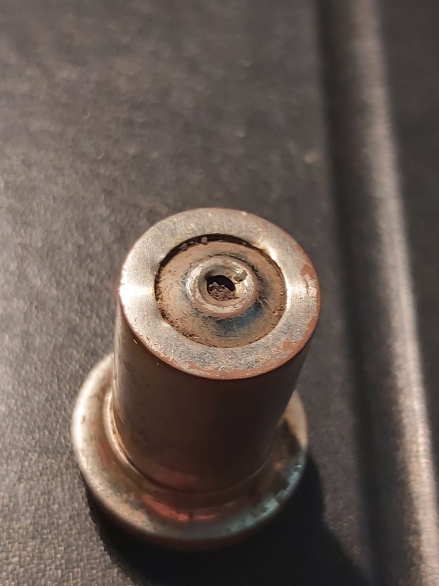 Добрый вечер. По вермахту попалась такая деталь. Длинна 3.5 см. Диаметр 1.6 см и 1.9 см. Маркировка: 40 0,65 0.17 и полуовал 41314. Материал, видимо, латунь. На большой стороне - резьба. Отверстие глубиной 2.5 см.Может кто знает что это? Заранее спасибо.