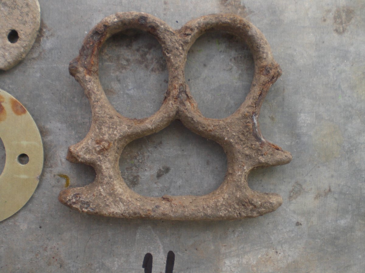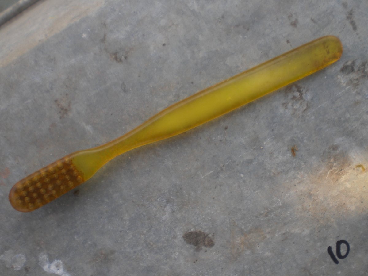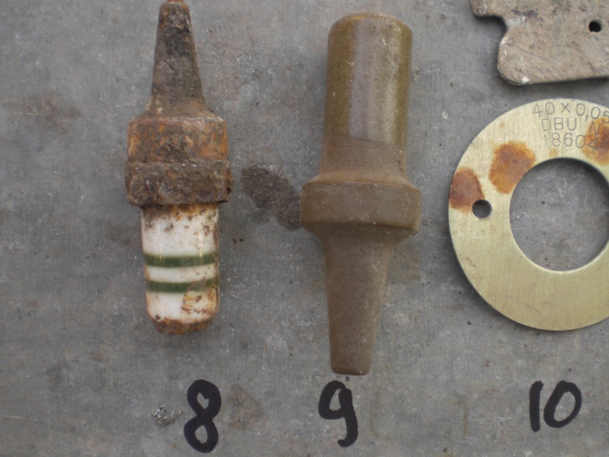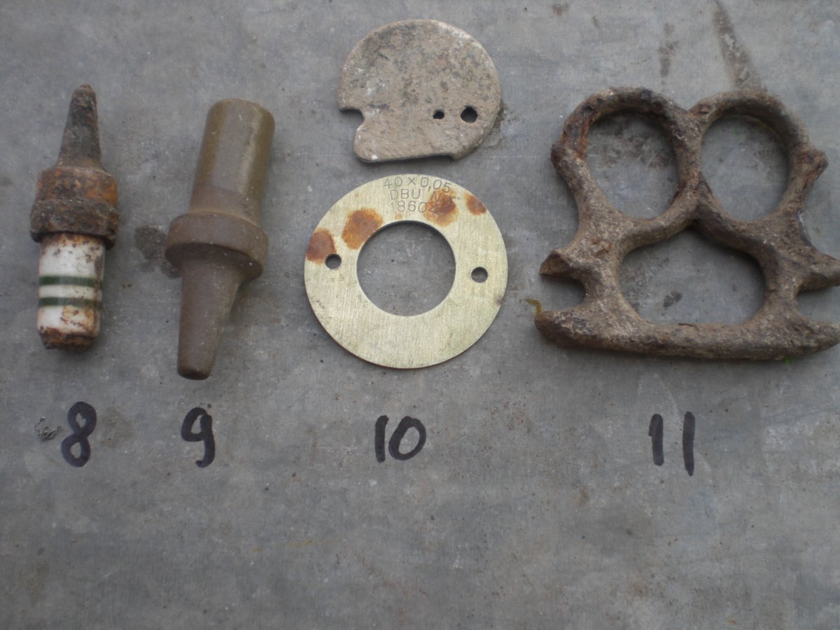 7ж- запал? 8- видится немецкая свеча. 9- керамическая штука. 10- в одном месте. алюминь вроде самолетная? 11- остатки кастета. немец или наш? Такие вроде выпускали и в царской России. Зубная щетка надпись трудно читаемая. Мне видится GARANTIE Прокомментируйте если что покажется знакомым. С Ув.