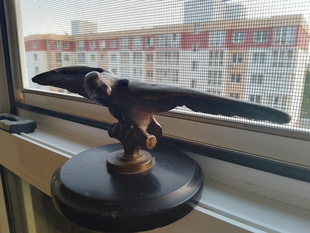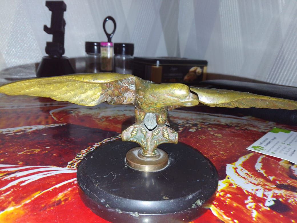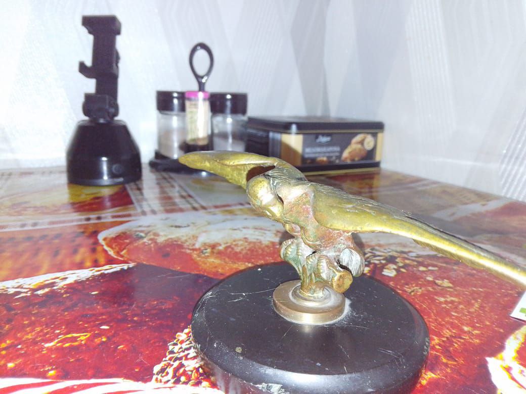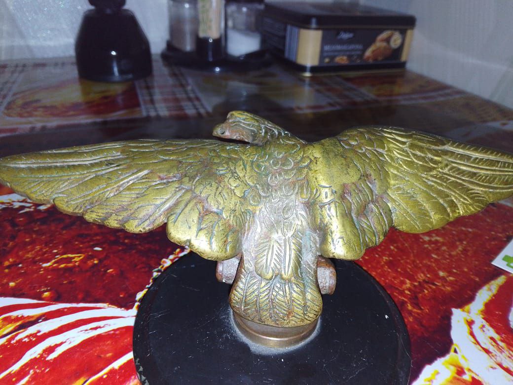 У знайомого на горищі знайшовся такий предмет. Підкажіть по періоду, та де міг стояти. Чорна підставка не рідна, маркувань ні де немає. У клюві скрізний отвір, може під кільце або щось ще. Довжина крилах 20 см, вага 1,5 кг. Фото лише такі. Дякую усім!
