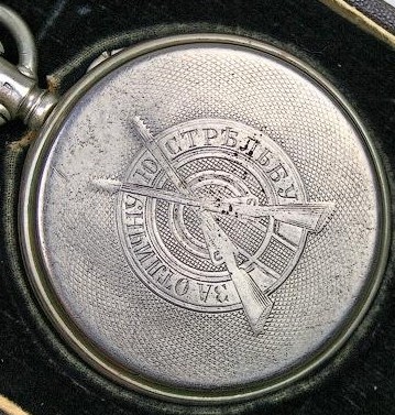 Вітаю! Корпус нагородного кишенькового годинника "За отличную стрельбу", виконавець замовлення торговий дім "Павел Буре" (https://www.google.com/search?q=карманные+часы+Павел+Бурре&sca_esv=1d2fbb10e57e1f9d&hl=ru-UA&gbv=2&tbm=isch&source=lnms&sa=X&ved=0ahUKEwinlLnc9tSJAxV2CBAIHd6dAboQ_AUIBigB&biw=1008&bih=610). Відомо, що корпуси такого годинника були або з мельхіору, або із золота або із срібла (нагорода мала відповідати статусу нагородженого). Тож шукайте на корпусі клеймо (https://kleima.ru/probirochnye-klejma-carskoj-rosii/). Думаю, якщо срібло, то буде 84 проба, адже по фото у Вас явно не золото. Якщо клейма немає, то цим годинником був нагороджений військовий із нижніх чинів. Більше про нагородні годинники: https://pikabu.ru/story/prizovyie_chasyi_v_tsarskoy_armii_6699186
