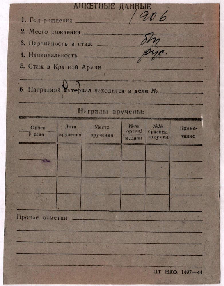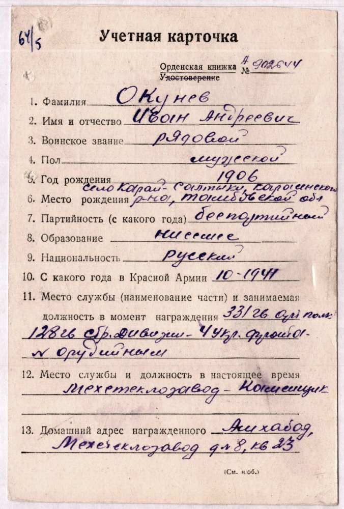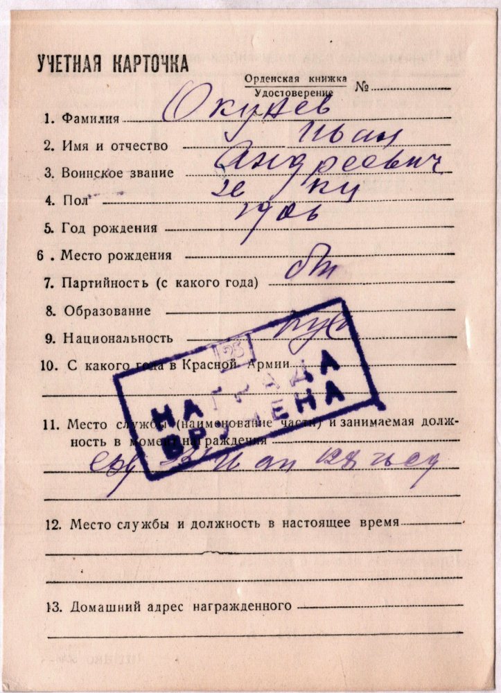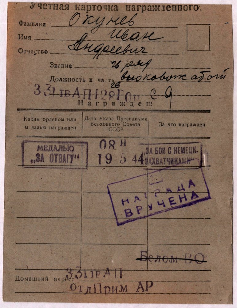 Я правильно понимаю, что номеров Отваг нет в учетных карточках потому, что карточки заполнялись позже, когда награды уже были утеряны? Адрес (улица) мог изменится, т. к. после чего Т. е., семья могла переехать.