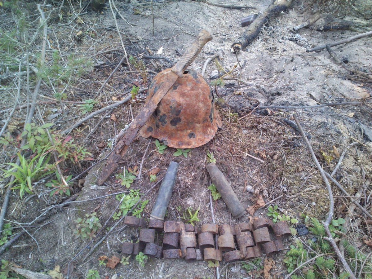 Сгоняли с товарищем на старые места, на одном не был лет 6, ну а второе это МК(всем привет кого видел кстати). Вот что удалось наковырять, к сожалению всё сфоткать не получилось т.к. села батара в телефоне... Первый выезд - зачётное яйцо, походу краска осталась, ещё не кислотил, попался китель(пуговицы и остатки сукна, но на этом всё(() ну и как обычно ещё пригоршни монет и пуговиц, их не фоткали. Второй выезд повеселее товарищ дёрну 2 штыка к маузеру и 42ку, правда один штык, как и касон видимо сильно погорели, второй штык из земли с ножнами, правда они подкачали((... А мне что-то опять везёт на всяческие вопы, если можно так сказать, 6 панцершреков, 2 колотухи, 2 вроде дымовые шашки и яиц штук 10. Яйца надо с сожалением признать оказались гораздо хрупче куриных и на фото не попали, остальное тоже гниль, кроме панцершреков, но я их боюсь колупать и захоронил обратно. Опять жменя монет и пуговиц, а ну и порадовал немецкий коль, который лежал под ящиком от шрека, нао отдать ему должное сохран у него был получше чем у тех же яиц)) Да, да бы не плодить темы - подскажите что за два вопа на фоне яйца??