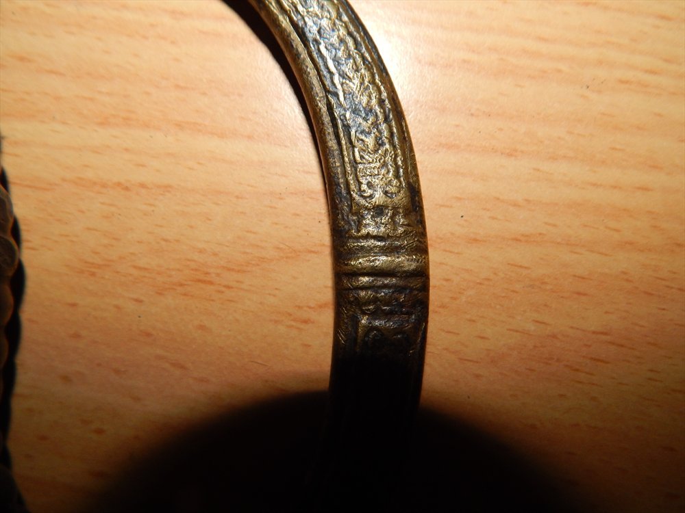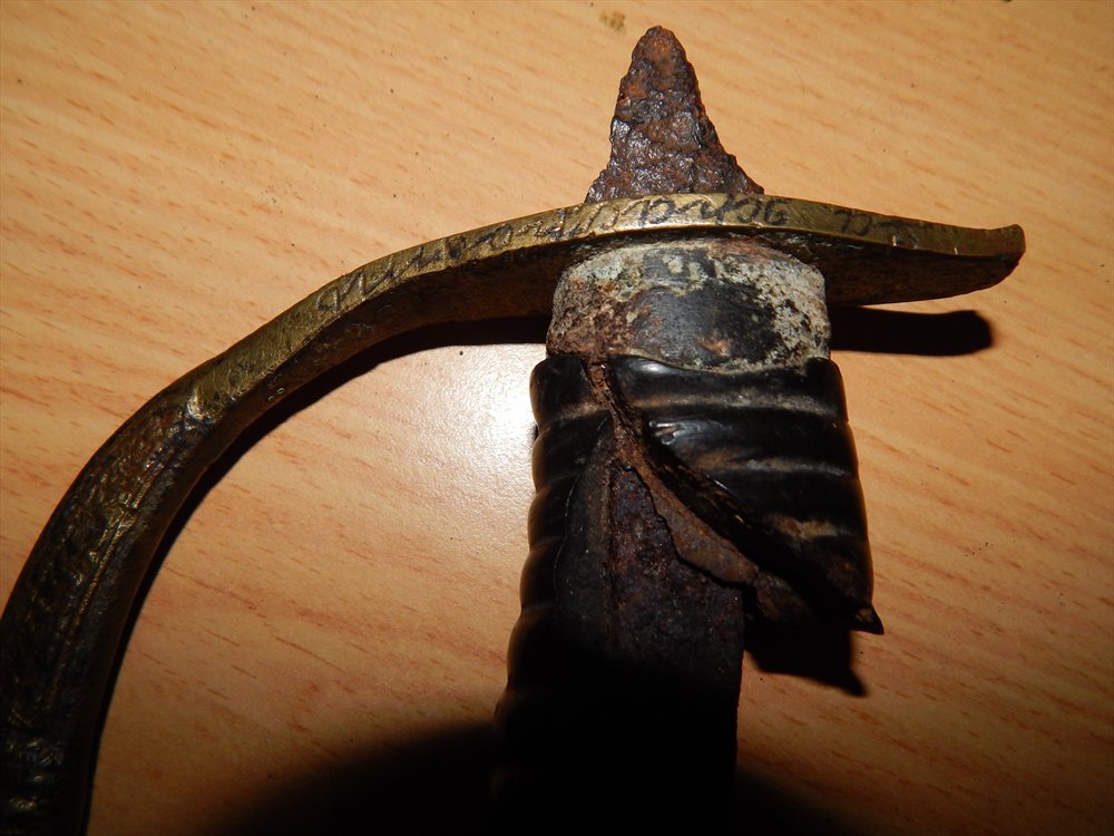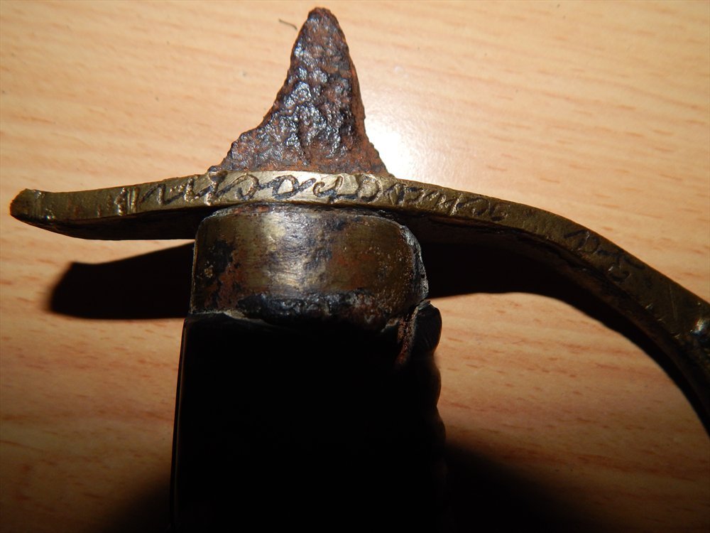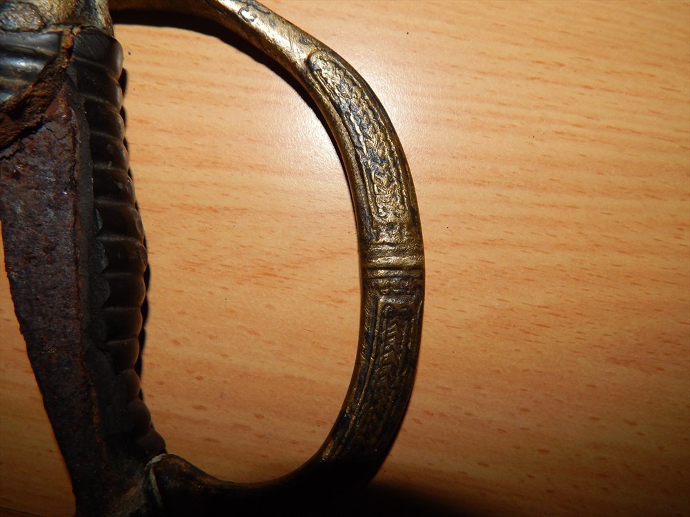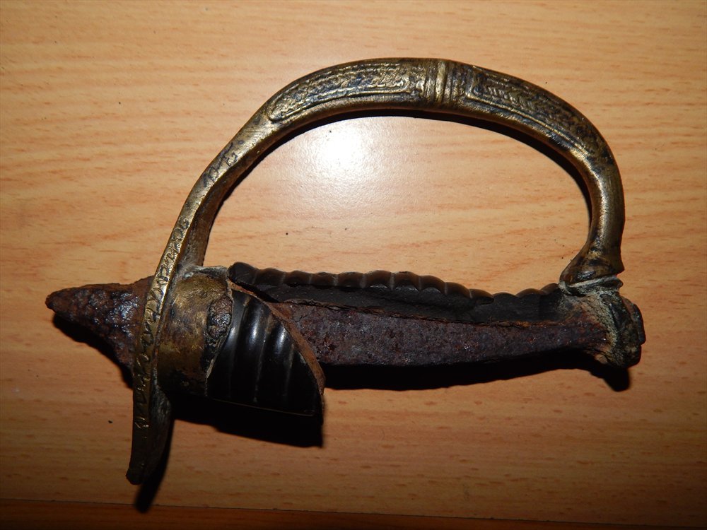 Это не комплектный эфес офицерской драгунки образца 1881г навершия утрачено оно могло быть как с монограммой так и без монограммы Н II, шашка была наградная очем свидетельствует надпись "За храбрость" время и люди поработало над приборами,кольцо под темляк обломана,на самой гарде видно следы утраты метала,что утрудняет реставрационные работаы,черен и нижнее кольцо на выброс,по цене от 500грн,а там как пойдет