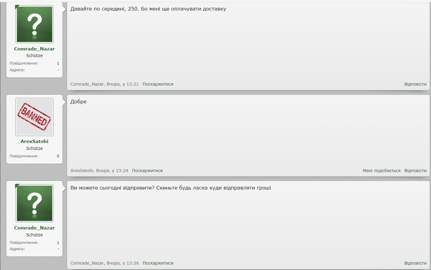 Ця людина запропонувала книгу за 500 гривень, я скинув ціну до 250. Договорилися, я оплатив книгу поповненням на номер телефону. Я оплатив. Ми договорилися що він відправить на нову пошту сьогодні(вчора) або завтра (сьогодні). Сьогодні зранку я пишу, коли ви відправите? він написав що в другій половині дня. На початку 19 години, я йому нагадую, і бачу що він забанений. Можна дізнатися, шановна модерація чому? Я перевірив цього контакту немає ні в телеграмі ні в вайбері