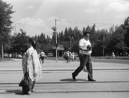 Донецк фото еще 80-х годов, я так понимаю что милиционер арбуз несет.А издали кажется ядро..пушечное..И наглядная агитация оттуда Захарченко с плаката с голубем мира и Захарченко в жизни.Все же забавный он ...