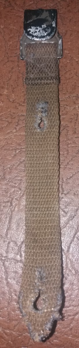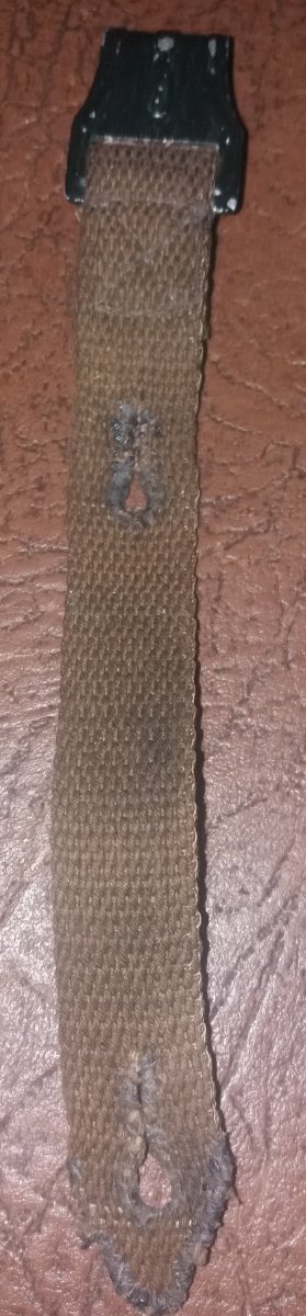 Есть еще один ременок без шпенька и клейм, зацеп так же алюминиевый,выкрашен в черный цвет, под черным цветом есть местами фельдграу.