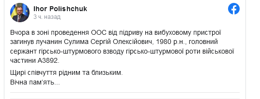 "Вчора в зоні проведення ООС від підриву на вибуховому пристрої загинув лучанин Сулима Сергій Олексійович, 1980 р.н., головний сержант гірсько-штурмового взводу гірсько-штурмової роти військової частини А3892. Щирі співчуття рідним та близьким. Вічна пам‘ять", - написав Поліщук.