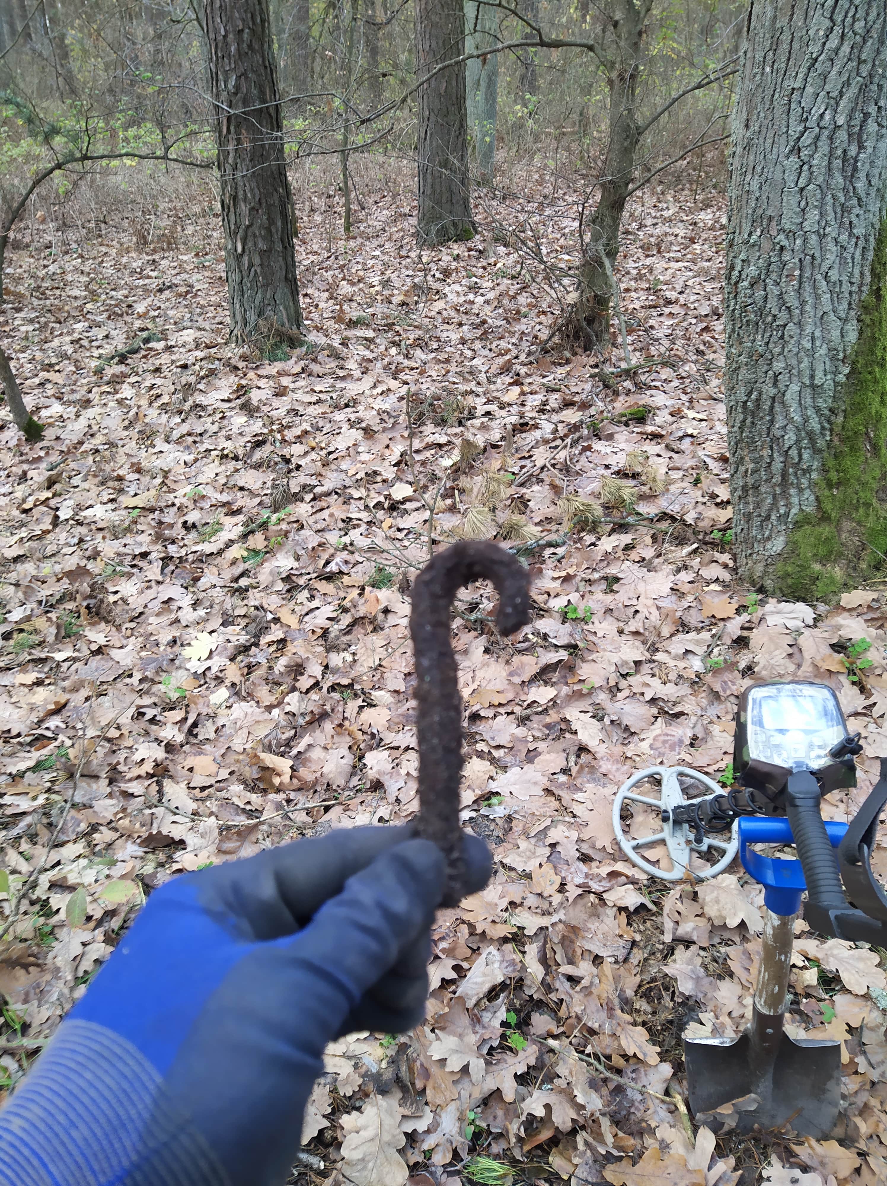 Вітаю, камради та гості форума. Підкажіть, будь-ласка, від/до чого може бути така деталька, загнута гачком. В поперечний профіль - кругла, матеріал - залізо. Може від воза? Неподалік колись була дорога, а при радянській владі ту ділянку вирубували і засаджували лісом. Щиро вдячний за ваші версії.