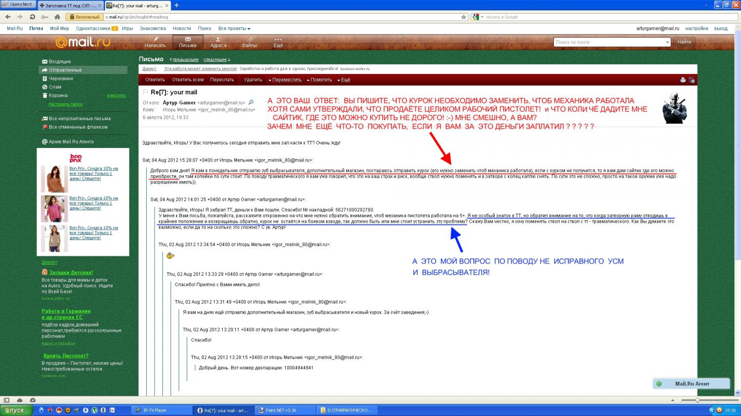 Короче, если вы не компинсируете мне до пятницы мои денежные расходы на приобритение ЗИПа или не перешлёте мне УСМ или курок, а так же выбрасыватель, я буду вынужден связаться с администрацией сайта! Наша с вами ситуация уже на их контроле! в случае вашего отказа, мне пообещали, что у вас в дальнейшем возникнут большие проблемы с торговлей на reibert!