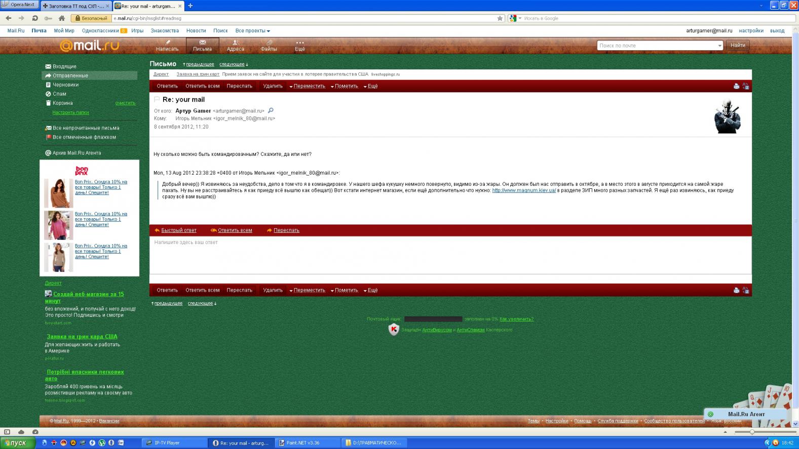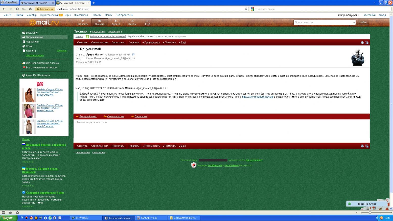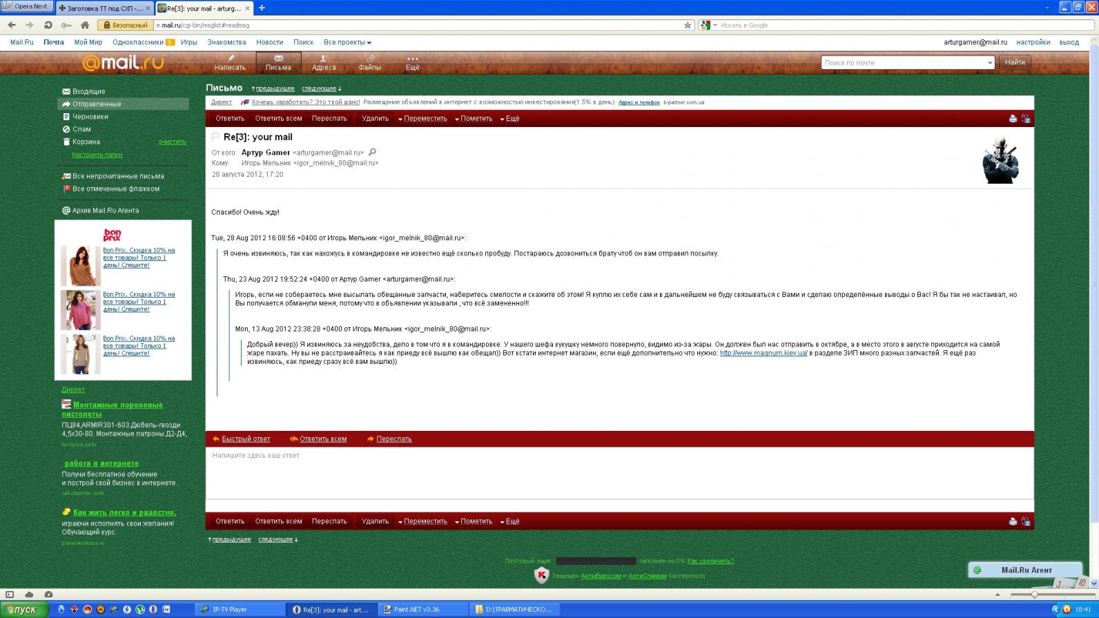 А я и не отмазываюсь, а решаю вопрос по справедливости. Верите вы мне или нет это ваше право. Я между прочем человек порядочный и не имею такой привычки оскорблять человека, который этого не заслуживает. На днях брат вам все перешлет.