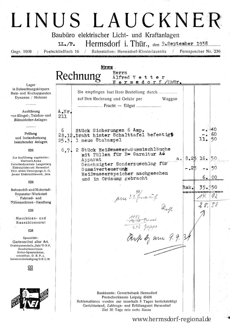 Може це допоможе. Рахунок-фактура фірми Лінуса Лаукнера від 9 вересня 1938 року - ліворуч видно, які послуги були надані та які речі були виготовлені.